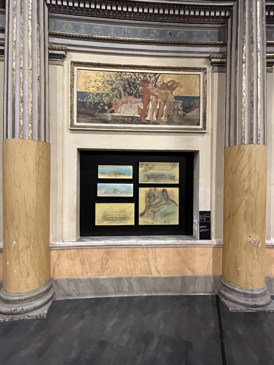 Ma la ragione più profonda di questo aggettivo è proprio per la mostra delle sue opere, che si tiene all’Acquario Romano. Orbene, questo è uno spazio circolare coperto da una cupola traslucida, quanto di peggio sia possibile pensare, per una mostra di architettura. Vi ho viste decine di esposizioni e mai nessuna stava così bene e appariva così giusta dentro questo spazio. Infatti, i suoi disegni dialogano perfettamente non solo con la circolarità della pianta ma anche con l’alto spazio che li sovrasta. I disegni sono inseriti dentro le nicchie che circondano l’ambiente e sembrano quasi essere sempre stati lì, cosi giusti appaiono, tanto perfettamente ambientati sono. Sembra veramente una mostra site specific. Quindi visitarla ne vale veramente la pena. Guardate i disegni nel loro insieme, ballandoci idealmente attorno, e poi avvicinatevi per osservare il segno, sempre ricco di significati stratificati.