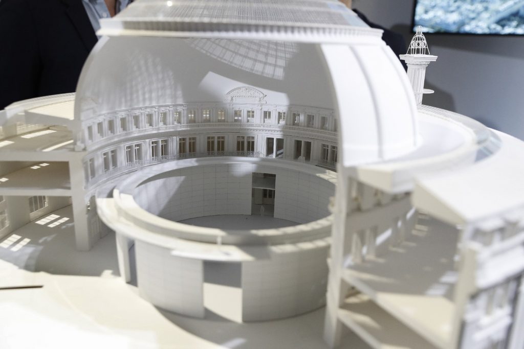 Questo progetto innovativo ha conservato la struttura circolare dell’edificio, la cupola e l’affresco, restaurato per l’occasione, creando invece, nella parte sottostante, una sorta cilindro in cemento di nove metri di altezza e di un diametro di 29 metri, che vede in cima un corridoio percorribile di ben 91 metri. Con una superficie totale di 13mila metri quadrati, sono 7700 quelli dislocati in sette spazi che, dal pianterreno al secondo piano, accoglieranno gli ambienti espositivi e pedagogici, un auditorium di 288 posti, un ristorante e altri servizi ancora.