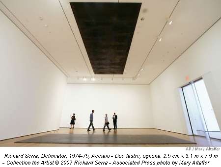 Delineator (1974-75), un tappeto di acciaio nero sormontato da una struttura identica ma perpendicolare, introduce senza troppi preamboli all’esauriente retrospettiva che il MoMA dedica a Richard Serra (San Francisco, 1939). Questo specchio strabico, schizzato al suolo e al cielo da un piedistallo abolito, non può che essere visivamente frustrante, non appena il senso di possesso delle orme sulla lastra sbiadisce nell’irraggiungibilità del soffitto. In balia di corpi autonomi che pretendono attenzione estetica ed emozionale, senza l’aiuto di noiosi cartelli esplicativi, lo spettatore riscopre che la percezione della forma non é univoca, ma essenzialmente determinata dalla soggettività della visione. Dentro Circuit II (1972-86), invalicabili diagonali di una stanza cubica, la scultura si dilata, ci confina in spazi angusti, o si restringe fino ad assottigliarsi, a seconda del punto di vista scelto.