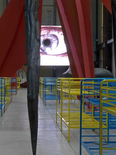 L’insieme degli elementi che richiamano il rifugio si arricchisce delle riproduzioni a grande scala delle installazioni della precedente Unilever Serie, quella di Louise Bourgeois, e delle sculture pubbliche di Alexander Calder, Henry Moore, Claes Oldenburg e Coosje van Bruggen. Ingrandite del 25% per azione della pioggia, solo evocata a livello sonoro, le sculture diventano un modo per riconsiderare il vocabolario esistente e permettere che le cose diano voce a significati diversi. Ed è così che il tempo presente di chi si avventura nella TH s’impasta del passato del luogo, vestendosi di futuro. Una sorta di “proliferazione tropicale” dove, nel 2058, si amalgamano corpi alti e bassi, trasformati in materiale apparentemente organico. In divenire.