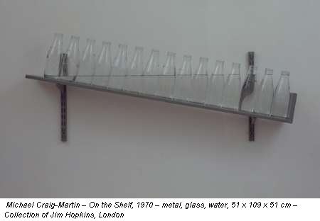L’attenzione allo specifico carattere dei luoghi visitati si ritrova già nell’unico film che Michael Craig-Martin (Dublin, 1941) ha realizzato nel 1963, mentre era in viaggio in Irlanda. Cresciuto ed educato negli Stati Uniti, l’artista ha potuto essere testimone della nascita dell’arte concettuale. Trasferitosi a Londra nel ‘66, ha contribuito allo sviluppo di questa tendenza con l’opera An Oak Tree (1973), un bicchiere d’acqua posto su una mensola ed accompagnato da un testo in cui si afferma la supremazia dell’intenzione dell’artista sullo stesso oggetto. In questa opera sono già presenti alcune delle idee che accompagneranno tutta la successiva produzione artistica di Craig-Martin: la preferenza per gli oggetti quotidiani, lo studio della relazione spaziale fra di essi, un desiderio di chiarezza e semplicità.