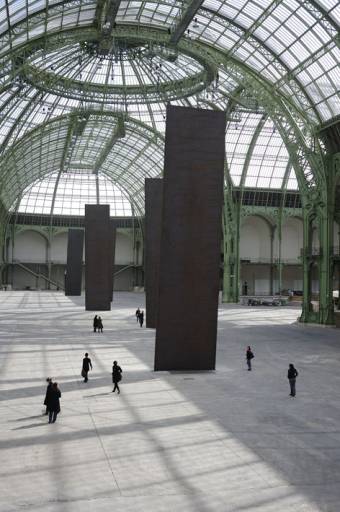 Dopo Anselm Kiefer, quest’anno è la volta di Richard Serra (San Francisco, 1939). L’invito all’artista che ha iniziato la propria carriera addossando le une alle altre, come un castello di carte, quattro placche di piombo pesanti più di duecento chili ciascuna in One Ton Prop (1969) poteva far pensare a un’accezione letterale di monumenta-lità. In effetti, entrando al Grand Palais non si può prescindere dalla riflessione che lo stesso Serra articola così prepotentemente sulla materia: cinque placche d’acciaio alte 17 metri e larghe 4 sono allineate come grandi totem lungo la navata unica dell’edificio, a sinistra e a destra dell’asse centrale, leggermente inclinate verso l’esterno o verso l’asse stessa.