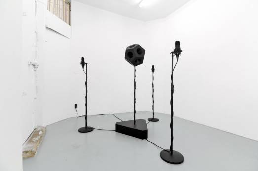 Michele Spanghero, Vol. (2018) sound installation lacquered wood, loudspeakers, modified microphones, microphone stands, audio cables, audio system (dim. variable – dur. 12 min loop) exhibition view at Galerie Alberta Pane, Paris, 2018 courtesy the artist and Galerie Alberta Pane, Paris and Venice, all images by Michele Spanghero