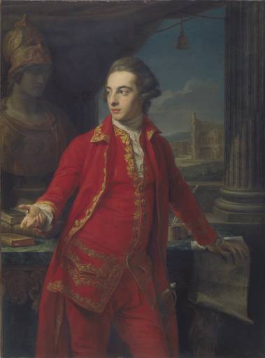 Sir Gregory Page-Turner, il busto di Atena alle sue spalle, protende la mano verso lo spettatore. Sullo sfondo, rovine classiche. Libri. Mappe. Una colonna. Incoraggiante, sembra invitarci a condividere la sua straordinaria esperienza di gentiluomo colto e raffinato, impegnato nel Grand Tour. Il viaggio all’estero come completamento di un’educazione politica, accademica o professionale era -sin dal Rinascimento- ritenuto un’esperienza essenziale. Tanto che coloro che non l’avevano provata, come il pittore William Hogarth, non potevano non provare un certo risentimento verso chi, invece, era stato più fortunato. L’itinerario seguito era quasi sempre lo stesso: Firenze, Roma, Napoli e Venezia. Una volta a Roma, era naturale che molti gentiluomini desiderassero eternare l’evento facendosi ritrarre dal pittore più famoso della città: Pompeo Girolamo Batoni (Lucca, 1708 – Roma, 1787).