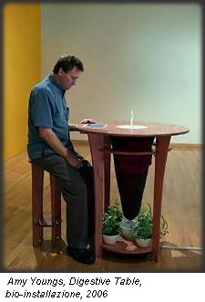 In Digestive Table, della californiana Amy Youngs, l’uomo è il primo anello di una catena biologica e nello stesso tempo testimone di un ecosistema di cui è parte. Una “tavola di digestione” accoglie gli scarti del cibo e, con l’aiuto di vermi e batteri, dà avvio ad un lento processo di decomposizione che trasforma il cibo in concime, futuro nutrimento delle piante che l’artista simbolicamente dispone ai piedi del tavolo.