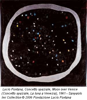 Nel 1961 viene invitato a partecipare ad una collettiva a Venezia intitolata Art and Contemplation, tenutasi a Palazzo Grassi, dove l’artista presenta una serie di quadri dedicati alla città lagunare. Proprio queste opere accolgono i visitatori nella prima sezione della mostra newyorchese, in una quiete atmosfera enfatizzata dalla strategica illuminazione diretta dei singoli quadri. Le grandi tele sono ricoperte di colore denso, manipolato con pennello e mani, ricche dell’oro peculiare dei mosaici bizantini di San Marco. Come in Concetto spaziale, Venezia era tutta d’oro (1961), dove un taglio verticale netto, esattamente al centro della tela quadrata, spezza le circonferenze chiaramente modellate a mano con un ricco e pastoso oro. Oppure Concetto spaziale, il cielo di Venezia (1961), dove i riflessi sono quelli dei vetri di Murano, che vengono inseriti nella composizione sempre formando cerchi alternati a piccole forature.