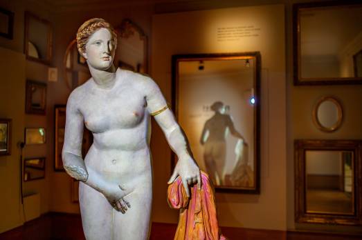Divisa in sei sezioni, l’icastica esposizione è introdotta da una sala con la statua dell’Afrodite di Cnido, simbolo dell’argomento trattato: si tratta di una copia romana del più antico nudo integrale femminile della scultura monumentale greca che Prassitele, rompendo con la tradizione, circa nel 340 a.C. pone in un tempietto circolare in modo che sia vista da ogni parte creando all’epoca un grande scandalo ben presto trasformatosi in attrazione turistica. Nella sala, la dea dell’amore è illuminata a tratti con luci colorate per renderla più viva e per ricordare che nell’antichità la statuaria era colorata rendendo ancora più veritiere le nudità (il bianco del marmo, infatti, tende all’astrazione) alternate provocatoriamente con strisce scure su seni e pube.