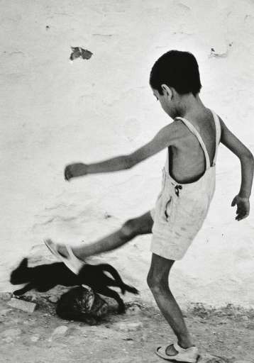 L’immagine scelta per la copertina del catalogo è emblematica. È la foto di un bambino con i calzoni corti, intento a calciare un malcapitato gatto nero in fuga contro i calcinacci bianchi di un muro sbrecciato. Potrebbe essere stata scattata nei vicoli di Napoli o di Palermo, è invece si tratta di una foto del 1954 di Oriol Masspons (Barcellona, 1928): prova inequivocabile di un sentire comune fra Italia e Spagna in quegli anni così controversi e “difficili” del secondo dopoguerra. Quelli della ricostruzione e dell’emigrazione, dell’abbandono delle campagne e delle spaventose periferie senz’anima delle nuove città.