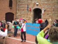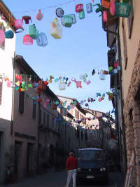 E se a Berlino l’artista tailandese spende quasi tutto il budget destinato alla sua opera per pagare dei massaggiatori che, in un salottino allestito al risparmio, massaggino per tutta la durata dell’esposizione il pubblico, come non pensare che con presupposti simili si attaglierebbe ancor più perfettamente alla kermesse berlinese l’installazione presentata il 16 settembre a Casole d’Elsa. Qui, nella piazza cittadina, Surasi Kusolwong ha allestito uno dei suoi celebri “mercatini”, un’operazione presentata più volte in giro per il mondo e che, a giudicare dall’entusiastica collaborazione dei viaggiatori di “Arte all’arte”, deve riscuotere il più fervido apprezzamento da parte del pubblico. Al taglio del nastro inaugurale una folla vociante e festante si riversa su quei tavoli pieni di ogni genere di oggetti (gli stessi che formano le ghirlande che decorano le strade cittadine), tutti in vendita a mille lire al pezzo, e in breve tempo ne fanno piazza pulita. L’artista ama dire che in queste sue operazioni parte da Monet per arrivare a Mondrian, e in effetti quei tavoli così pazientemente decorati con la loro bella esposizione di merci colorate (attivissima è stata la collaborazione dei bambini di Casole nella preparazione dell’installazione e delle ghirlande) vengono in un lampo riportati alla loro originaria natura di piane superfici geometriche colorate.