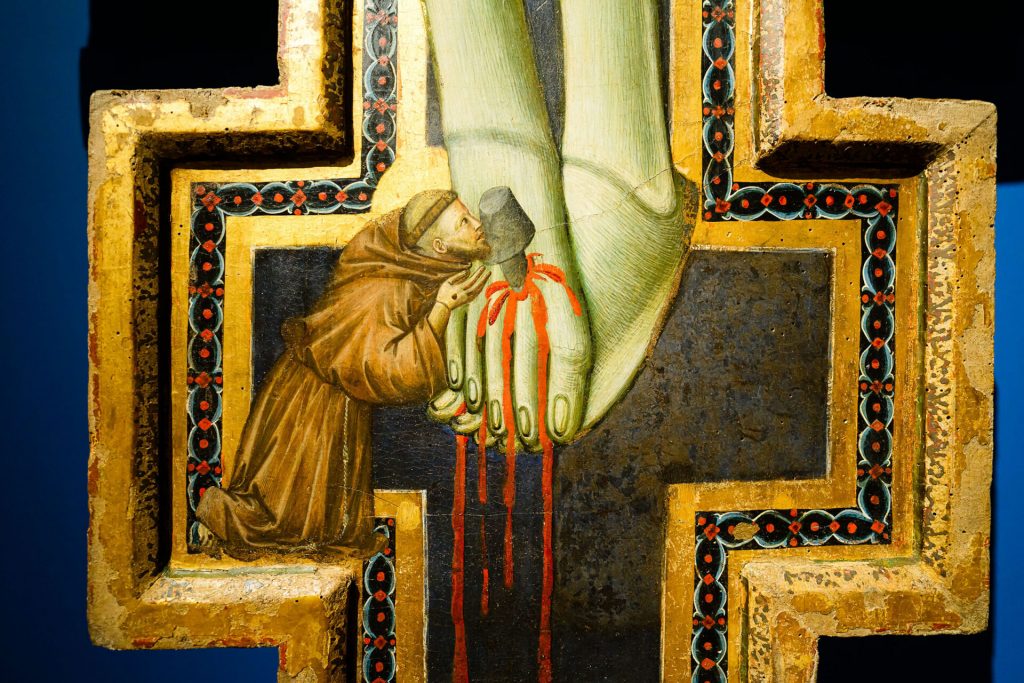 Il presupposto teorico della mostra è chiaro: la vicenda francescana e quella giottesca non sono semplicemente contemporanee, ma strutturalmente convergenti. Francesco introduce una nuova forma di relazione con il mondo — fondata sulla prossimità, sull’esperienza diretta, sulla sacralità del creato — mentre Giotto, quasi specularmente, restituisce all’immagine una dimensione incarnata, tangibile, esperibile. Se la pittura bizantina tendeva a sottrarre il visibile alla contingenza del tempo, Giotto lo riconsegna alla storia, alla gravità dei corpi, alla verità degli affetti. Come avrebbe scritto Roberto Longhi, è qui che «l’uomo entra nella pittura», e con esso l’intero spettro delle sue emozioni. E non è un caso che Georges Didi-Huberman abbia ricordato come l’immagine, per essere davvero tale, debba «prendere posizione»: Giotto, in questo senso, non rappresenta semplicemente il mondo, ma lo assume, lo espone, lo rende visibile nella sua evidenza concreta. Non si tratta soltanto di un’evoluzione stilistica, ma di una trasformazione antropologica dello sguardo.