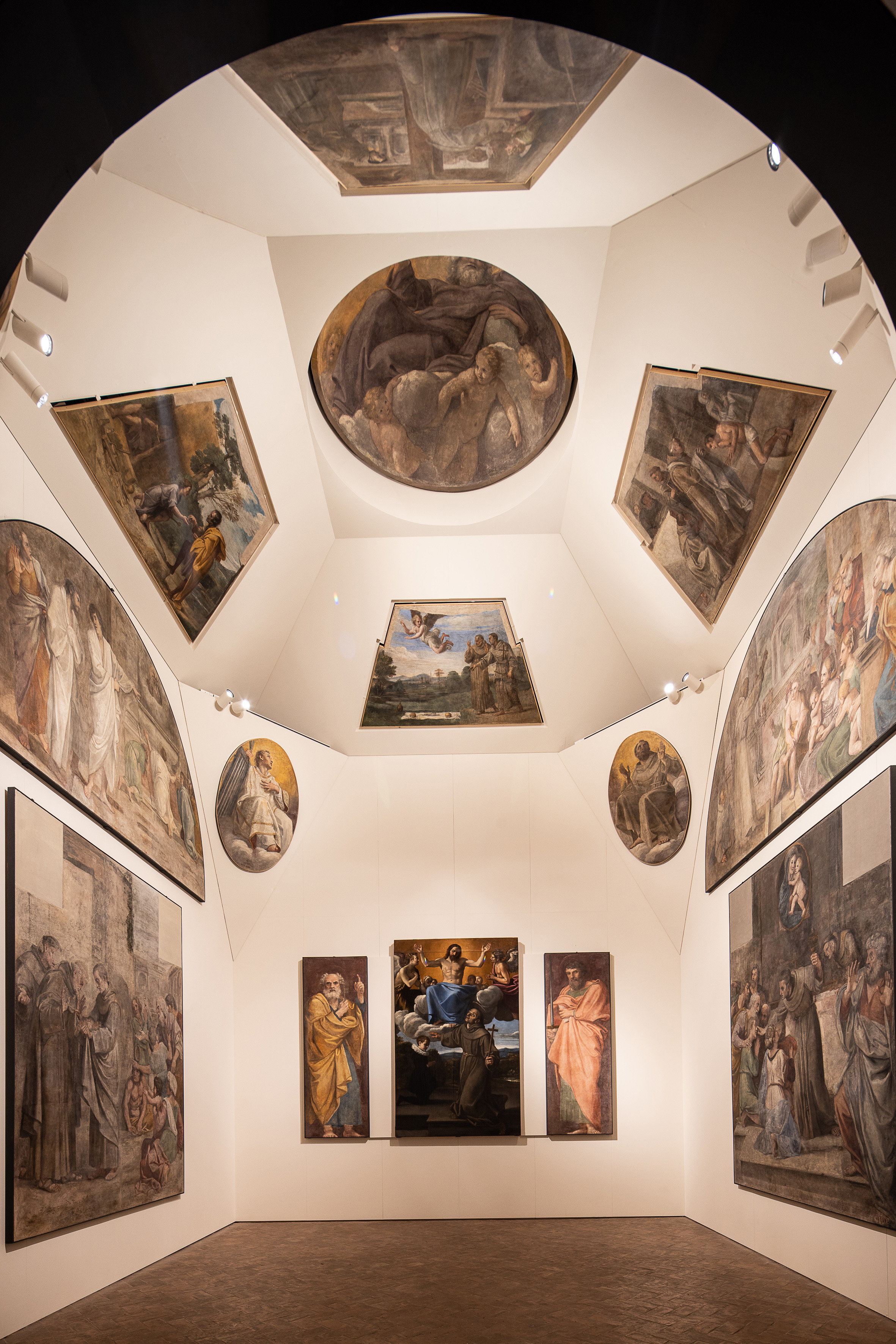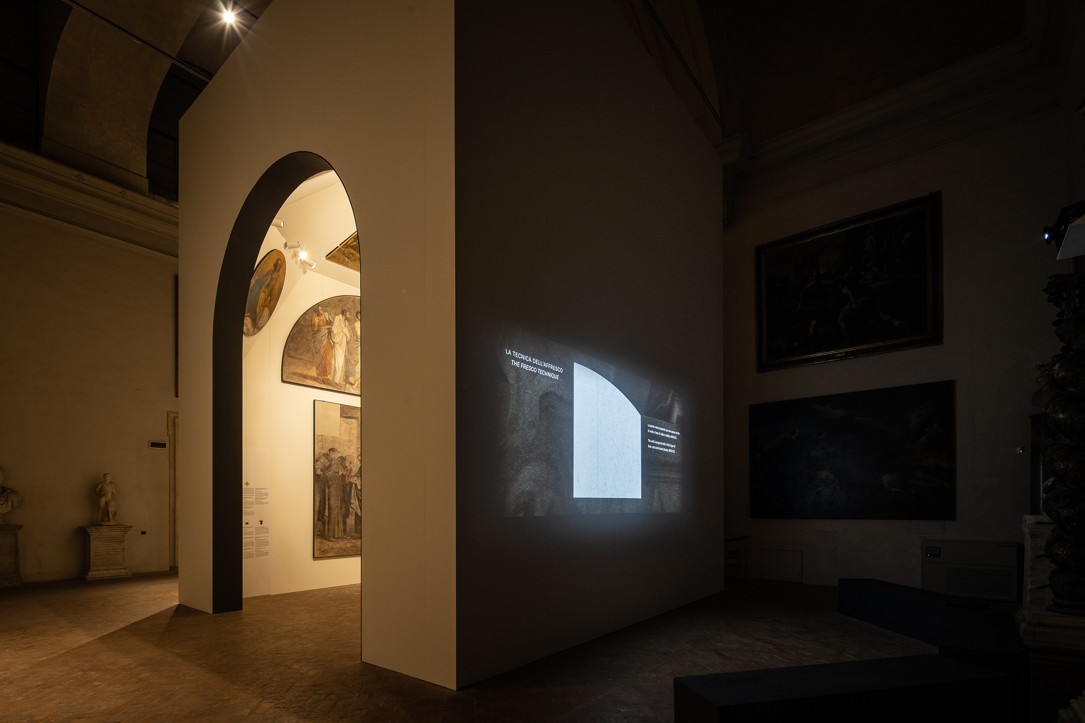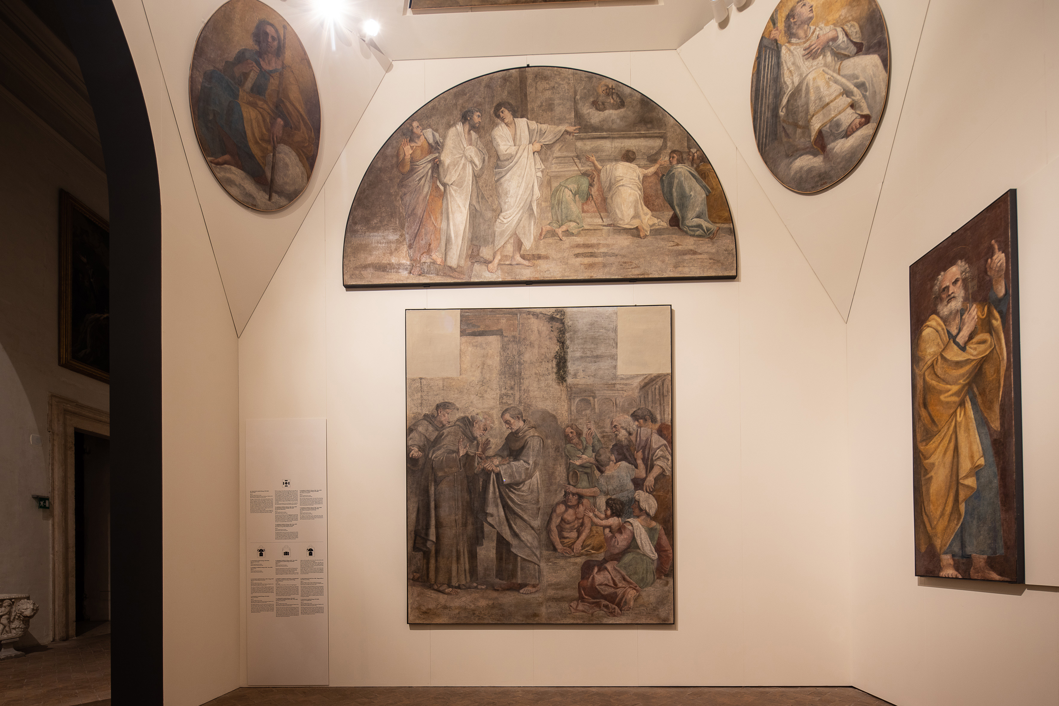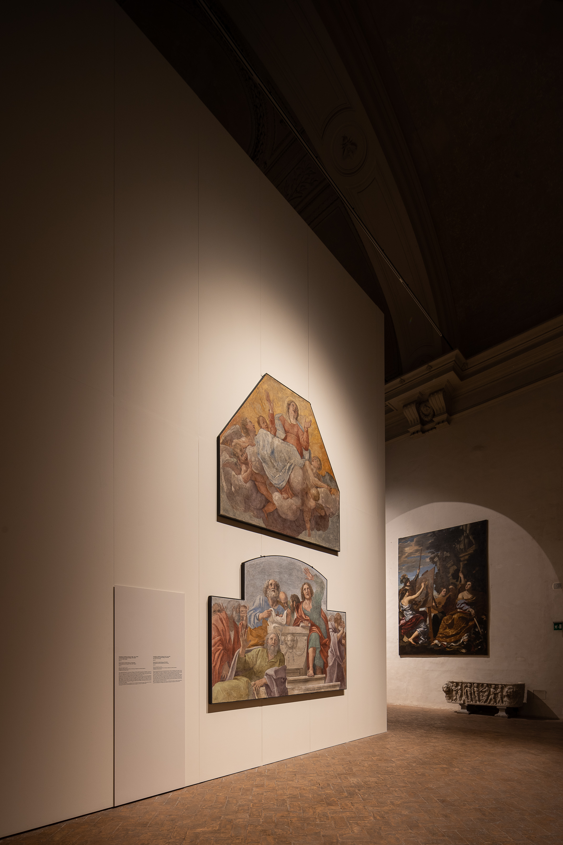 La mostra romana di Palazzo Barberini raccoglie – oltre a una selezione di disegni e una video su iconografia, autori e restauro – la ricostruzione a grandezza naturale della cappella Herrera, entro la quale i 16 affreschi protagonisti sono collocati secondo l’ordine originario. Pareti e soffitto della Sala Marmi accolgono ovali, mezzelune e immagini trapezoidali entro nicchie precise, consentendo al pubblico di capire quale fosse la prospettiva del fruitore del tempo.