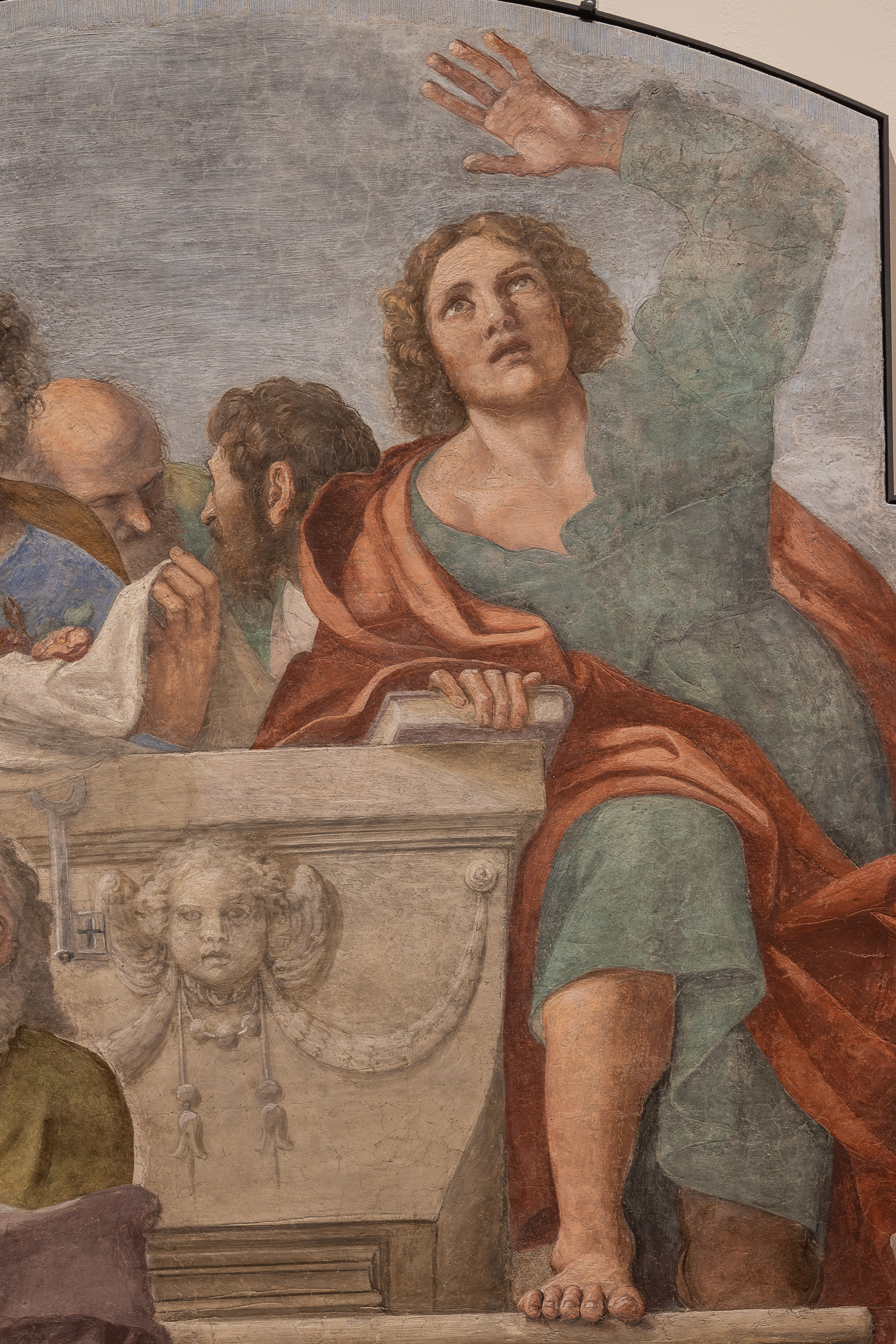 «Fu nel 2011, quando ero ancora curatore della pittura italiana al Prado, che ho cominciato ad avviare un lavoro di ricerca e di restauro di questi affreschi», ricorda Andrés Úbeda de los Cobos, sottolineando come ricostruire la storia di questo ciclo parietale abbia messo in luce i legami tra i pittori bolognesi del seicento romano. Assieme al Carracci infatti si riconoscono fra gli altri, il tocco del Domenichino e di Francesco Albani. Quella rosa di grandi maestri sorti dall’Accademia dei Desiderosi o degli Incamminati che all’alba del VXII secolo trassero le fila dei loro celebri predecessori cinquecenteschi.