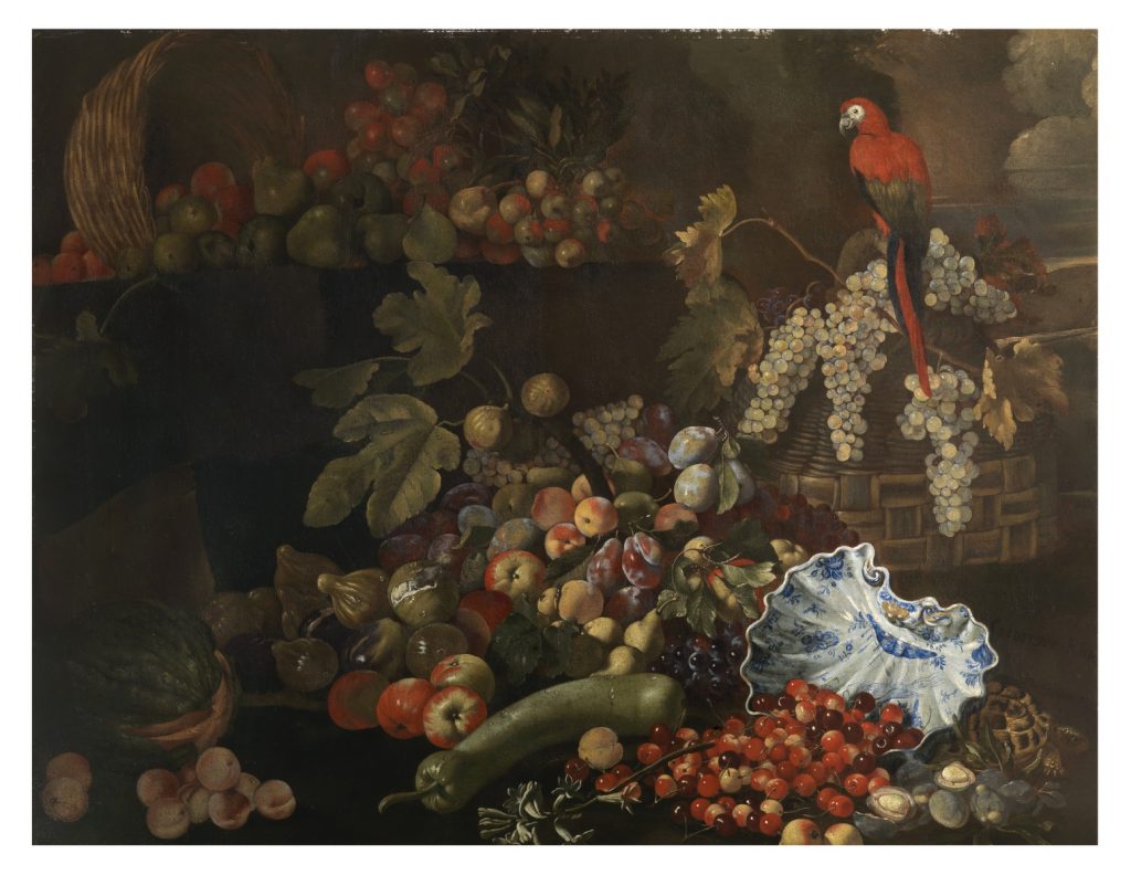 Giuseppe Ruoppolo (Napoli 1630–1710), Natura morta con frutta, zucche, pappagallo, tartaruga e zuppiera di maiolica, 1670-1680, olio su tela, 99×127,5 cm