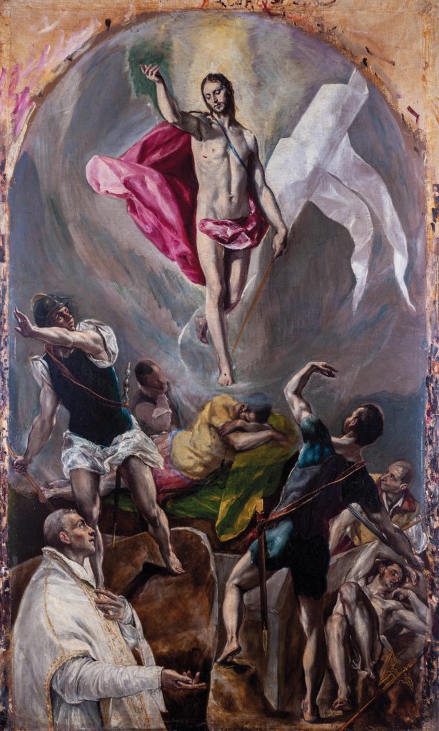 La mostra presenta tutte le opere che costituivano l’impianto della cappella, eccezion fatta che per il San Bernardo oggi nelle raccolte dell’Hermitage di San Pietroburgo in Russia, del quale si espone una riproduzione. Di particolare interesse è a nostro avviso la Resurrezione, originariamente collocata alla destra dell’altare, che mostra un Cristo dall’aspetto apollineo, slanciato e luminoso, posizionato al centro di una composizione vorticosa, in cui l’artista dipinge la scena con pennellate dense e furiose. La tela è esposta senza cornice, ed è pertanto interessantissimo osservarne i margini, dove si trovano i rapidi tocchi di colore che El Greco sembra aver “picchiato” sul canvas per diminuire la densità della pennellata o studiare le nuances, creando una sorta di composizione astratta. L’arte di El Greco è vibrante, espressiva e colma di pathos: stupisce ancora oggi la capacità dell’artista di emanciparsi dai registri classici e impostati della tradizione, per liberare sulla tela delle forme che sembrano disintegrarsi e i cui contorni sfumano in un tratto dipinto come a singhiozzo.