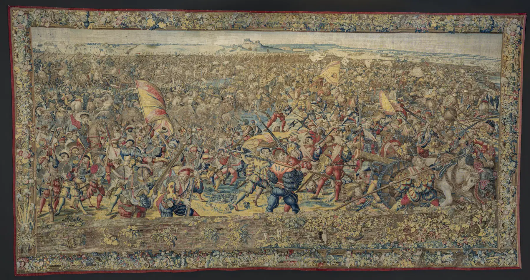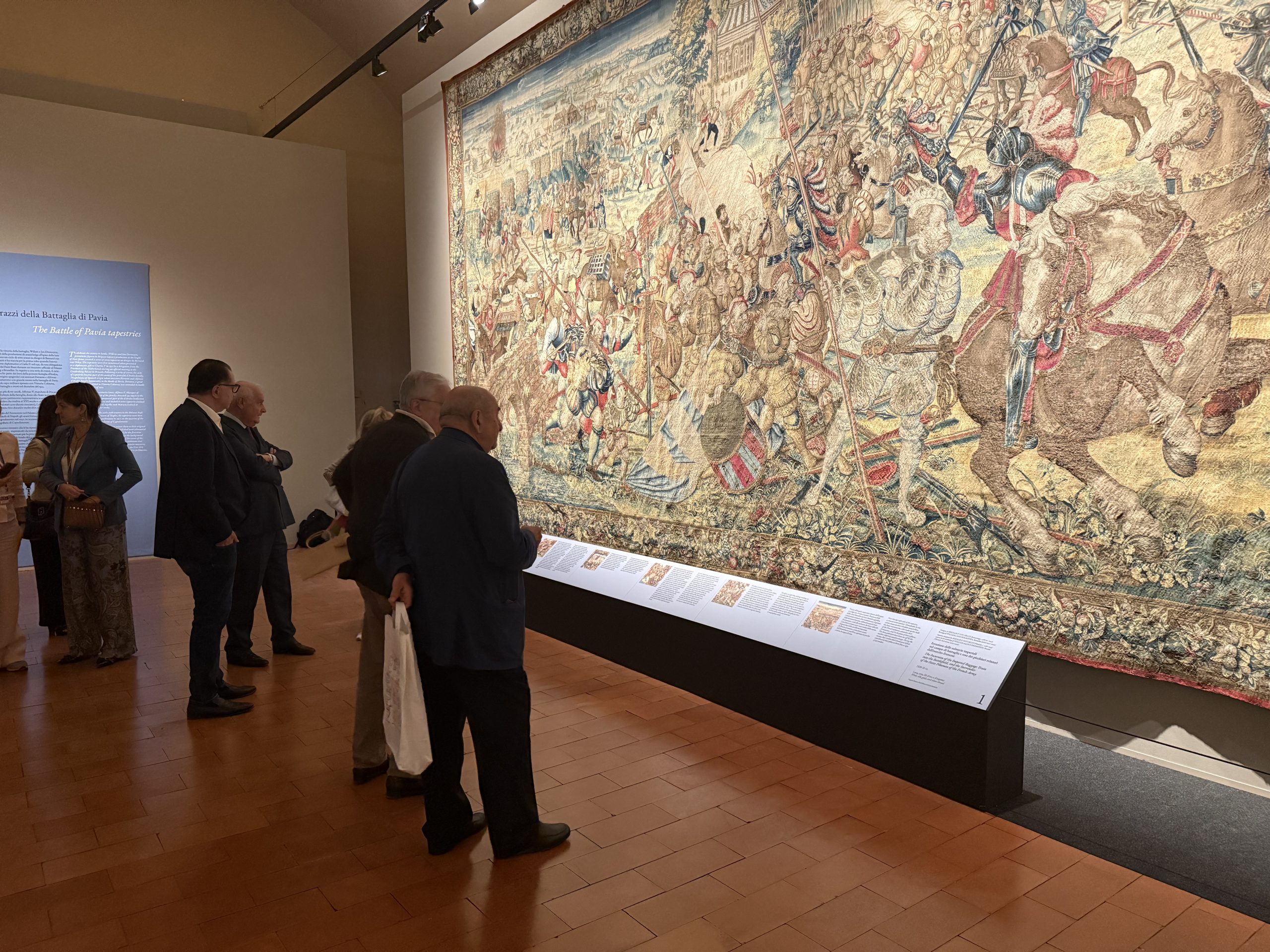 Il climax del percorso è affidato all’ultima grande sala, dove i visitatori sono immersi nella narrazione visiva dei sette arazzi della Battaglia di Pavia, tessuti tra il 1528 e il 1531 dalla manifattura fiamminga di Jan e Willem Dermoyen su disegni di Bernard van Orley. Qui la battaglia si dispiega come racconto totale, in cui celebrazione politica, attenzione al dettaglio e modernità dello sguardo convivono in una rappresentazione che travalica il semplice documento storico. Dopo il recente restauro e le tappe espositive negli Stati Uniti, il ritorno a Pavia consente di rileggere questi arazzi nel luogo che ne ha generato l’immaginario, restituendo continuità tra evento, rappresentazione e memoria.