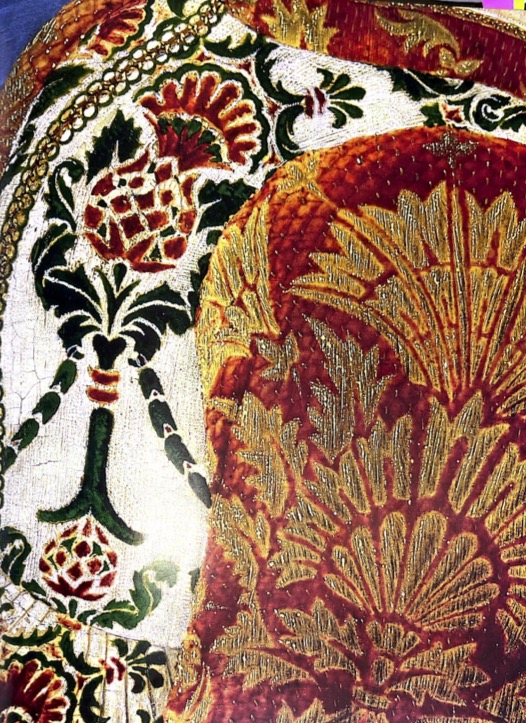 Il busto, ritratto di tre quarti, fa risaltare gli elaborati dettagli delle maniche in velluto di color rubino dell’abito della dama: il ricco motivo a broccato in filo d’oro che decora spalla e braccio della manica sinistra è dunque leggibile, nella sua continuità, anche sull’avambraccio destro. Le maniche sono cucite su una gamurra in lana di colore rosso vivo, aderente sul busto e che si apre invece in ampie pieghe all’altezza del bacino; la gamurra è caratterizzata da una cerniera dorata, da un’ampia scollatura sulla schiena e da una, più arrotondata e sobria, sul petto che lascia intravedere una sottile camicia bianca usualmente usata per proteggere il vestito ed evitare il contatto diretto con la pelle.