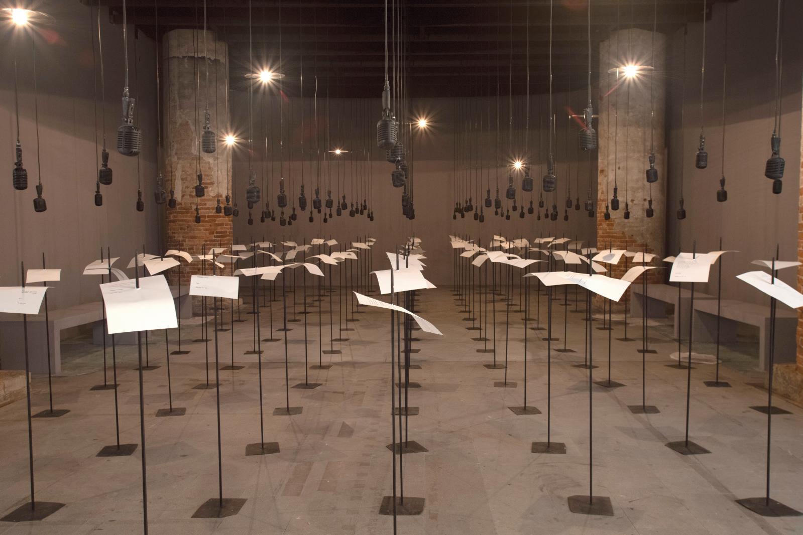 All’Arsenale è indimenticabile l’installazione sonora dell’indiana Shilpa Gupta, tra le migliori in mostra dal titolo For, in your tongue, I cannot fit. E tra installazioni video, animazione digitale, fotografie, tanta pittura e sculture di qualità, le arti visive inscenano lo spettacolo del mondo, che si annuncia “fumoso” , spaesante nell’opera Mi fuma il cervello di Lara Favaretto, con la nebbia che compare e scompare davanti all’entrata del padiglione centrale ai Giardini. L’overdose di violenza aumenta giorno dopo giorno, ormai siamo assuefatti al crollo delle utopie e al tanto cinico torpore della ragione; vacillano anche i principi dei diritti umani, sotto coltri di guerre e imperiture mattanze in cui sono sempre i più deboli a morire.