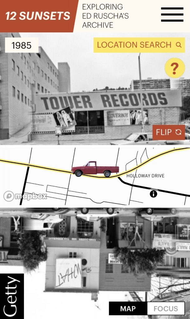Immaginati di essere nel ’65, ’73, ’85 o ’98, al fianco di Ed Ruscha che scatta centinaia, migliaia di fotografie con una Nikon motorizzata, montata tramite un treppiede sul retro di un pick-up color magenta: 35 km passando per il centro di Los Angeles, Beverly Hills e West Hollywood, dove la strada è riconosciuta con il nome di Sunset Strip per un breve e altrettanto leggendario tratto di 3 km. Di certo non sarà mai una sensazione paragonabile ma, grazie al database interattivo realizzato dal GRI – Getty Research Institute, è possibile “guidare” un fantomatico pick-up, ricreato dall’originale, lungo il Sunset Boulevard, da downtown L.A. fino alla spiaggia, in un viaggio nel tempo che copre 12 road trip avvenuti nell’arco di ben 42 anni.