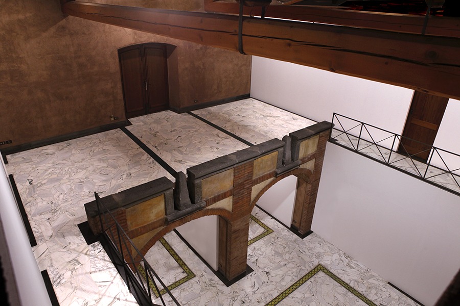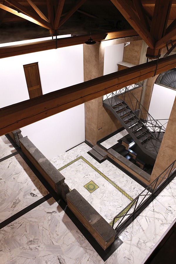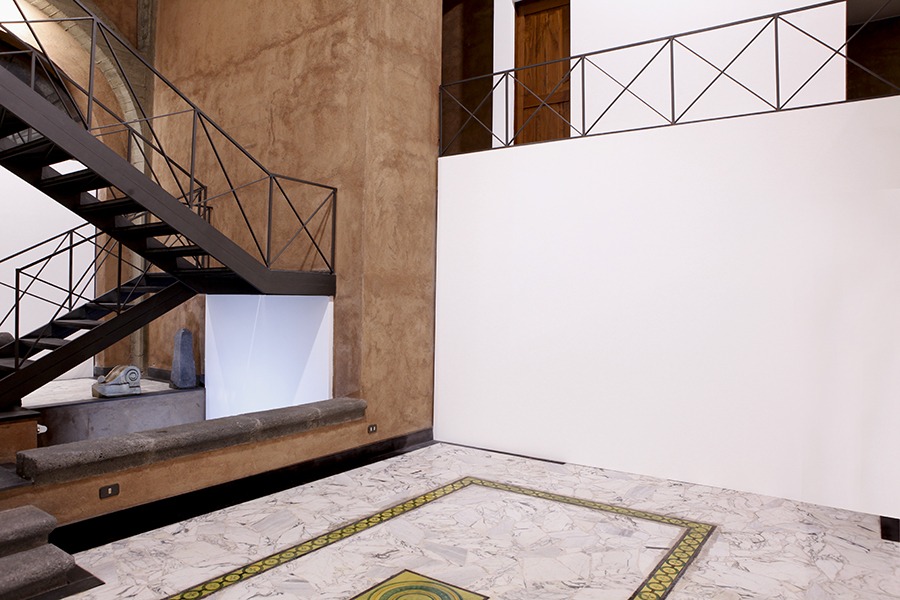 «È come detto un palmento costruito intorno alla metà dell’Ottocento per la spremitura dell’uva. Si articola su due livelli, oggi collegati da una scala, ristrutturato dall’architetto Vittorio Brescia. Le pareti interne sono ricoperte da quello che da noi si chiama sestiato, un mix di terre laviche e calce: è l’intonaco esterno che colora di rosso o di nero il paesaggio etneo… Io ho pensato bene di rovinarlo ricoprendo 100 mq delle vecchie pareti con una contro-parete bianca, in modo da facilitare il lavoro agli artisti, altrimenti in difficoltà rispetto a uno spazio così connotato. La superficie è di circa 350 mq. Il tetto è imponente, e presto ristruttureremo il sottotetto che consentirà di ampliare lo spazio di ulteriori 180 mq».