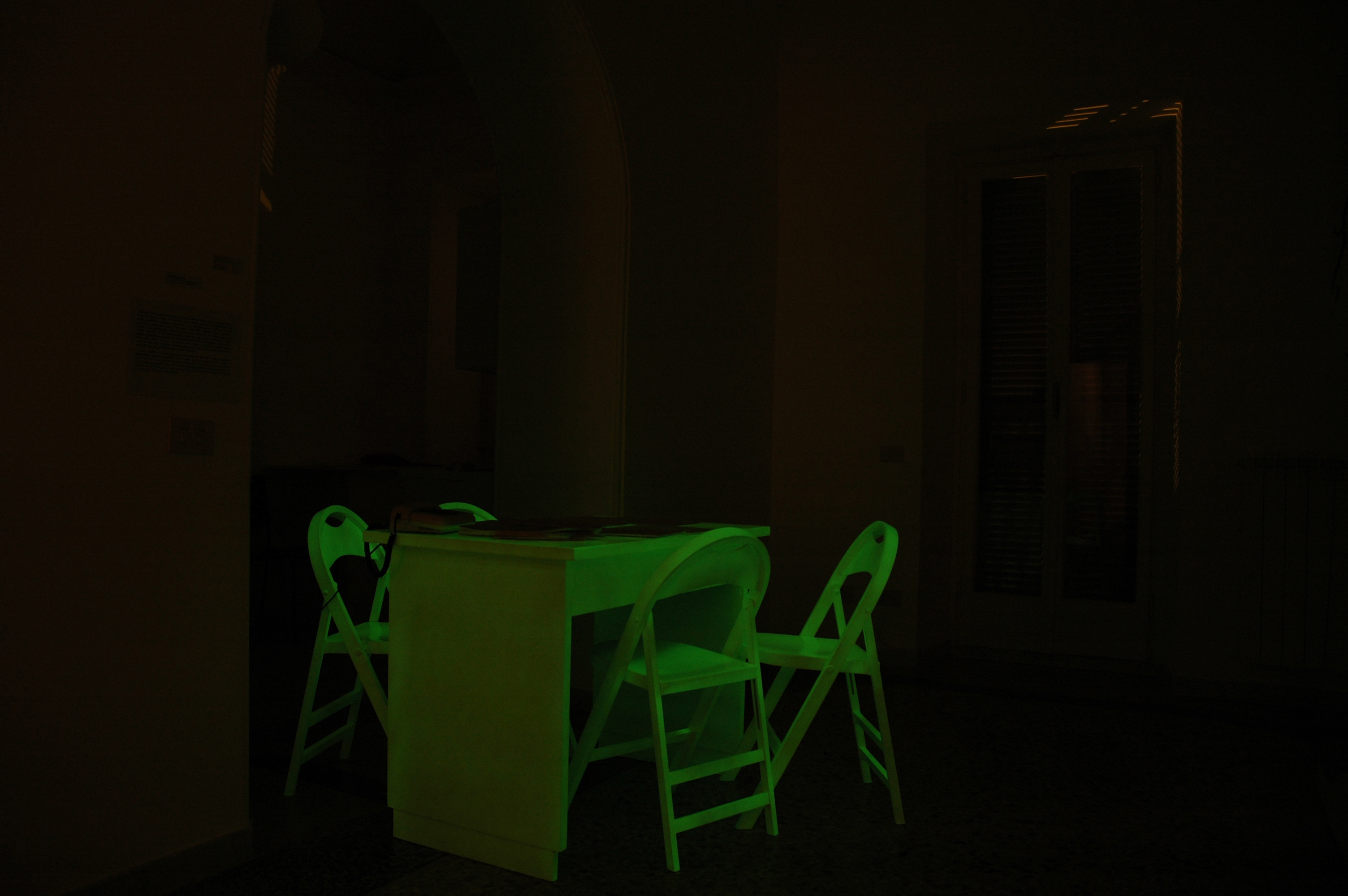 «Mentre il Padiglione di Arte Fiera chiude, si spengono le luci e i guardiani se ne vanno, alcuni dei mobili (sedie, panche e tavoli) già presenti nell’arredo della fiera e distribuiti in tutto lo spazio espositivo si illuminano perché dipinti con una pittura fosforescente», così Garutti descrive la sua opera, che è stata realizzata col supporto di Henoto, azienda leader nel settore degli allestimenti. «Questi oggetti, ordinari e quotidiani, si mimetizzano nell’ambiente circostante, tanto da non essere riconosciuti come arte. Il pubblico non li vedrà se non come semplici oggetti d’arredo», continua l’artista, maestro riconosciuto e docente all’Accademia di Belle Arti di Bologna nei primi anni ’90.