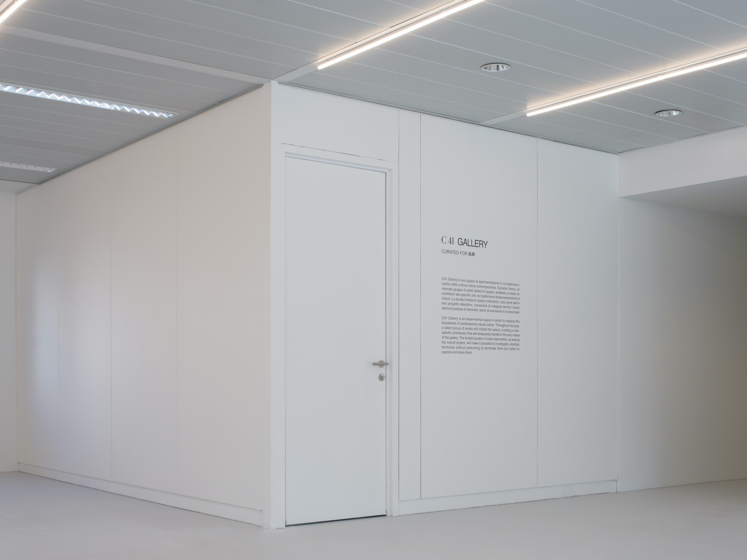 C41 Gallery si configura come «Uno spazio sperimentale in cui esplorare i confini della cultura visiva contemporanea», spiegano da C41, specificando che durante l’anno lo spazio sarà abitato da un gruppo selezionato di artisti, al fine di creare un intervento site-specific che trasformerà temporaneamente la natura stessa della galleria. «La durata limitata di ogni lavoro, così come il progetto complessivo, consentiranno di indagare territori incerti senza la pretesa di dominarli, piuttosto di esplorarli e condividerli».