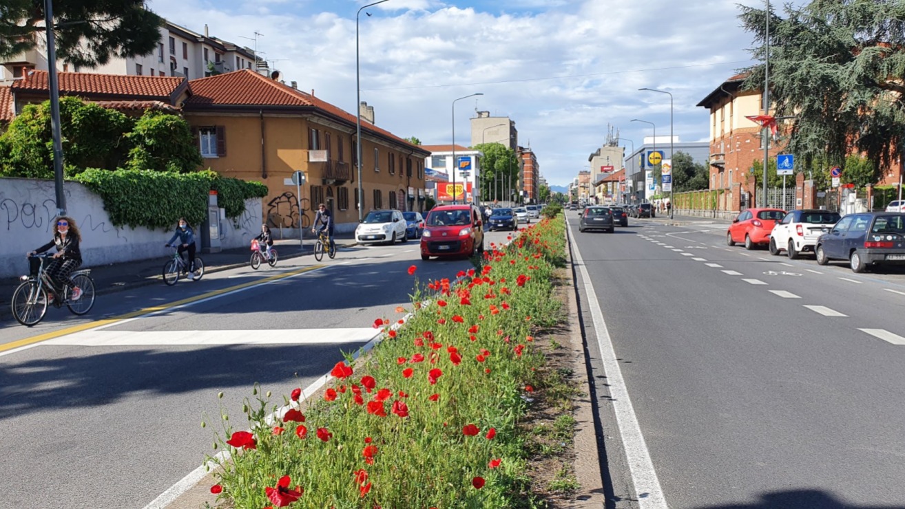 Tra gli interventi più instagrammati di Angelo Caruso, social artist, c’è Color Earth Linea Rossa (2019-2021), intervento stagionale composto da papaveri rossi incastonati nello spartitraffico in viale Monza, tra le arterie commerciali più trafficate e inquinate di Milano, dove una sosta nel punto sbagliato di un pedone o di un ciclista è altamente rischiosa. Caruso, dal 2000, propone opere di arte pubblica partecipata in diversi luoghi anche decentrati della città, volti alla rigenerazione urbana con l’obiettivo, seppure in maniera ludica e poetica, di porci domande sulle criticità del presente al la ricerca di comunità.