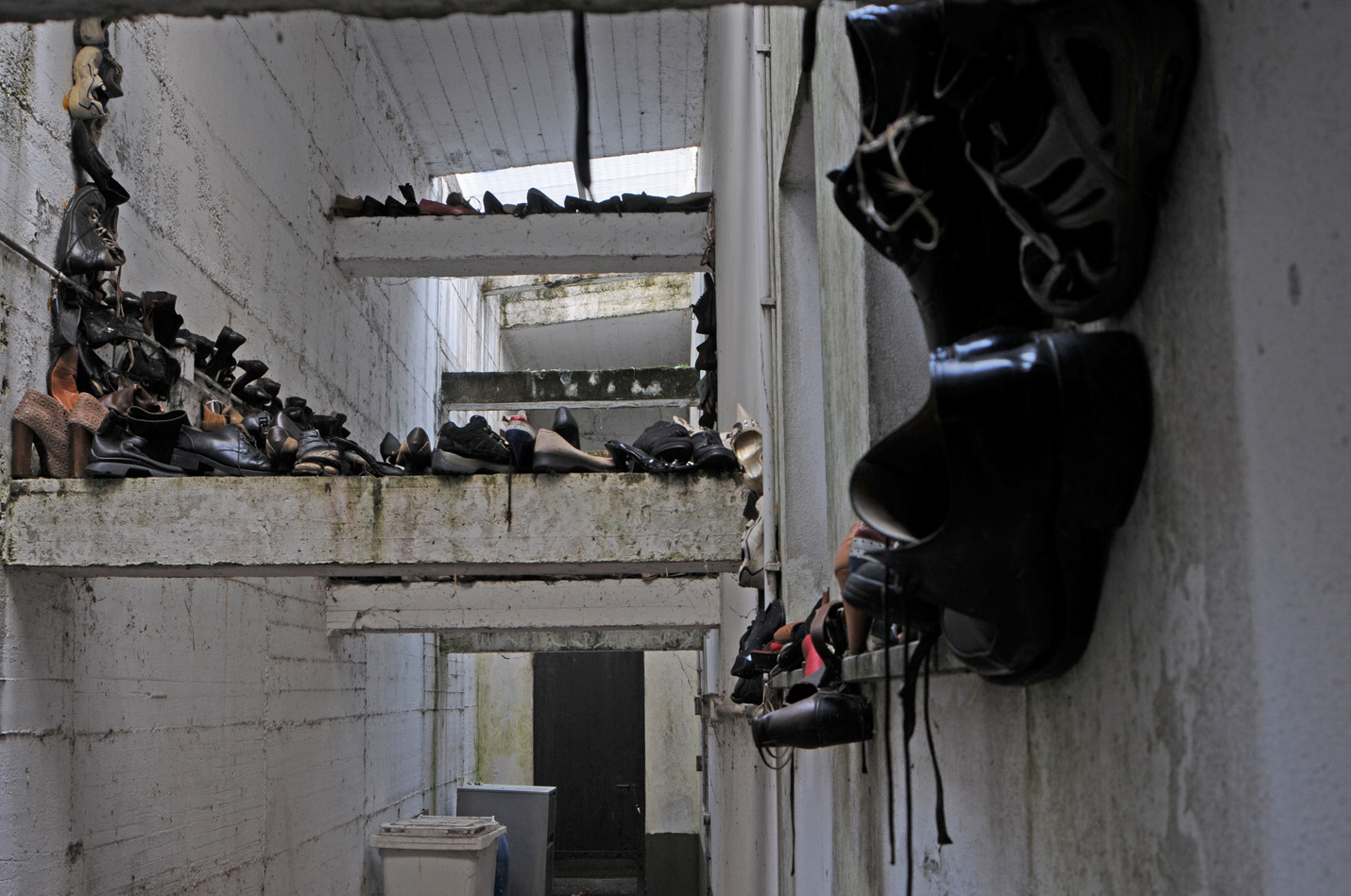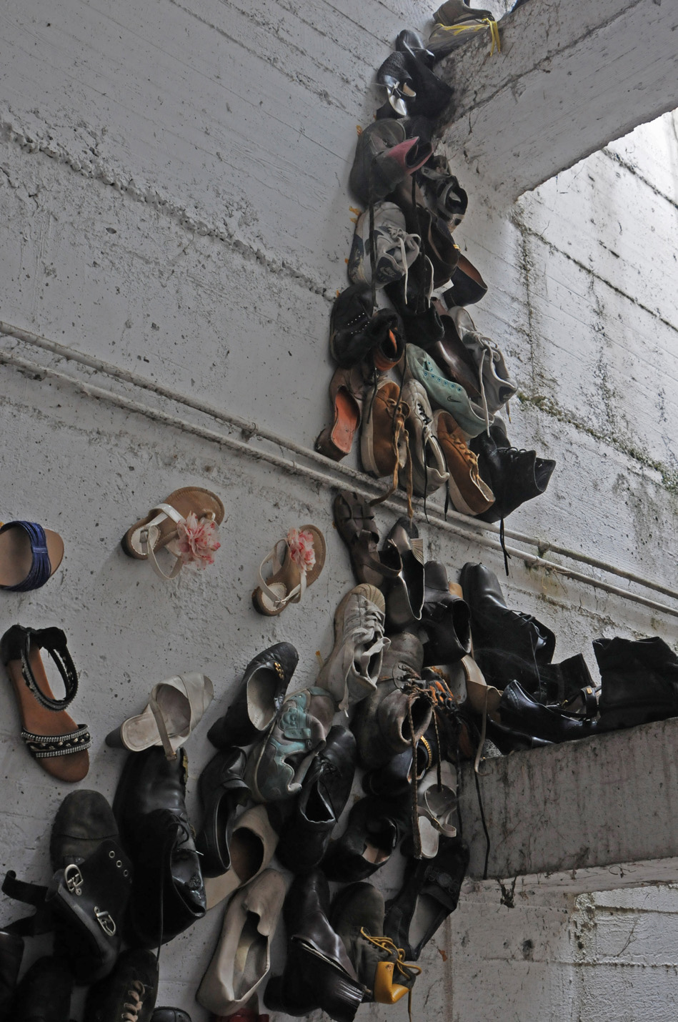 L’ultima opera di Angelo Caruso si intitola Percorsi (2021), ideata in uno spazio interno dell’Anfiteatro della Martesana, aperto al pubblico e utilizzato come deposito di una ciclofficina, senza identità, mappato da un numero imprecisabile di scarpe usate e donate dai cittadini a seguito di una call diffusa in rete. In questo luogo, scarpe usate di tutti i colori, fogge e misure, maschili e femminili sono ready made di vissuti, inquietanti presenze che si snodano lungo le pareti come lumache, perimetrando tracciati tortuosi, evocando quelle rotte di immigrati e rifugiati politici costretti ad abbandonare i loro Paesi per sopravvivere, afflitti da povertà, conflitti, persecuzioni e violazioni di diritti umani.