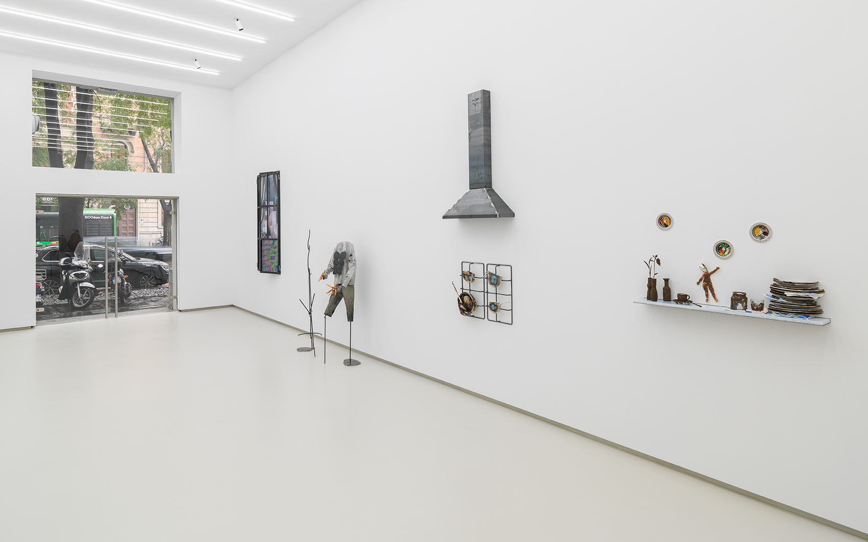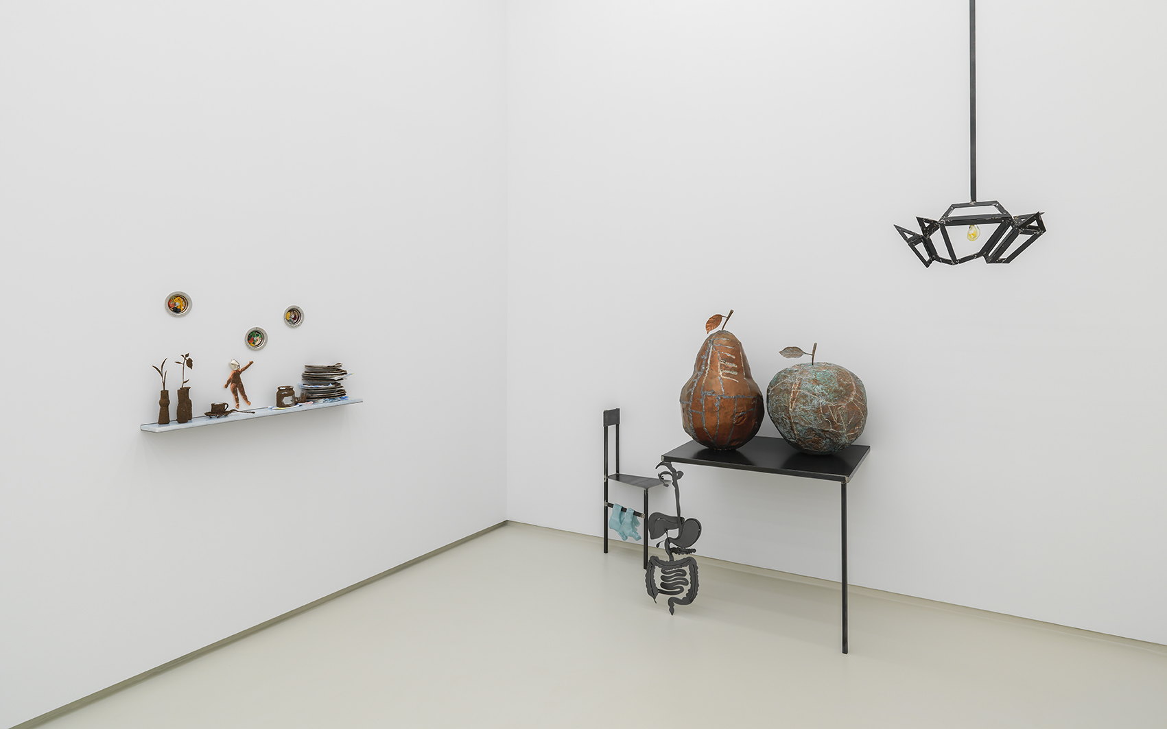 E in questa anomala casa delle bambole di Lucia Leuci, in cucina dove il tempo è scandito dal rito del cibo e relazioni affettive, non sfugge allo sguardo più attento la perfezione artigianale del dettagli di sculture in ferro, materiale protagonista degli arredi di questo interior surreale ma equilibrato. Tra le altre opere, è struggente per una poetica semplicità Uovoteka (2020), che racchiude nella forma della casa – contenitore di uova tutte diverse, significati plurimi e narrazioni simboliche.