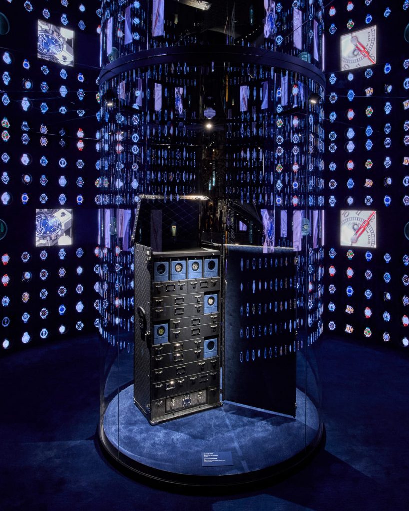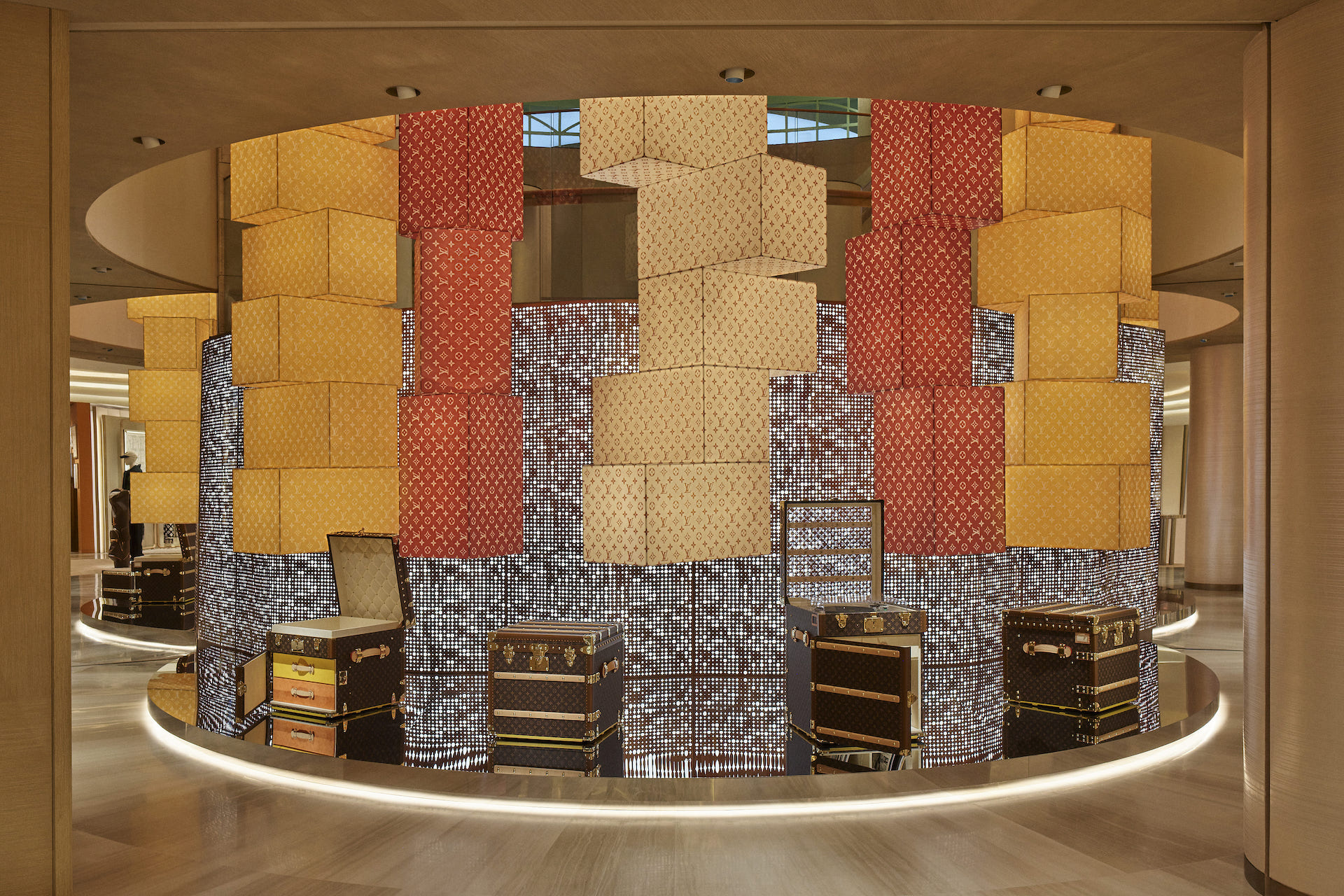L’esperienza si sviluppa in diverse sale e piani: inizia nella Trunkscape room, dove i visitatori attraversano un tunnel rivestito di Boîte Chapeau (cappelliere), introduzione all’arte pionieristica del viaggio di Louis Vuitton. Questa installazione site-specific anticipa il percorso culturale e conduce al negozio al piano terra. Oltre, una scala a spirale avvolta da un display LED dinamico forma una linea temporale vivente dell’artigianato, evocando paesaggi e movimento.