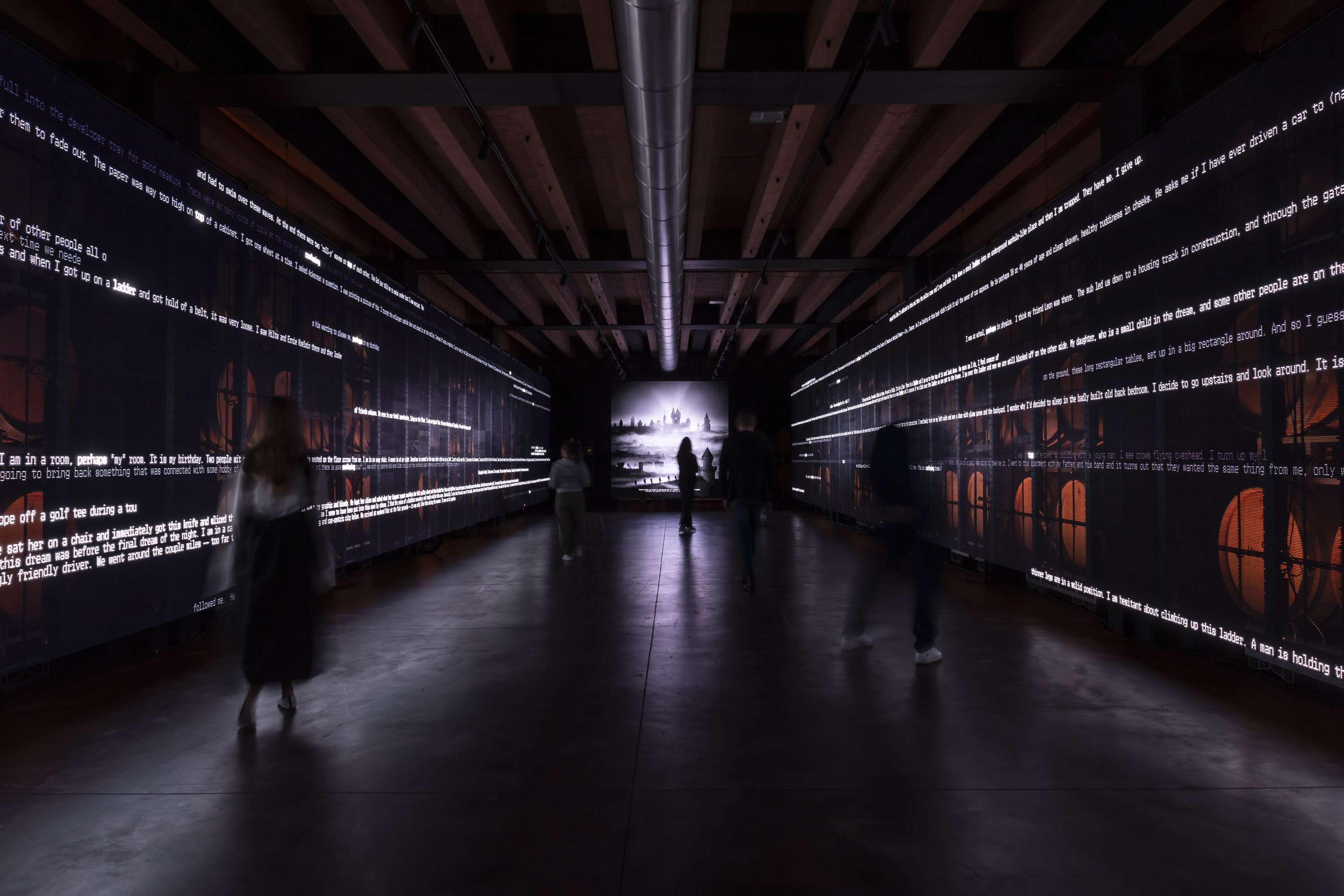 Il cinema viene definito la macchina dei sogni ed è per questo motivo che fuse* punta a proporre un’esperienza dal gusto cinematografico. Dei 28.748 sogni, ne sono stati selezionati 30 dall’archivio del Laboratorio di Psicofisiologia del sonno e del sogno dell’università di Bologna. Questi 30 sogni si susseguono nello schermo centrale mentre, lateralmente, ogniqualvolta vengono nominate delle parole, queste ultime appaiono evidenziate sui pannelli led trasparenti adagiati davanti alle botti. Come mai? Parole come “crocodiles”, “sea”, “ship”, “bear” sono infatti state estrapolate da tantissimi sogni, raccolti come testimonianze oniriche nel data-set californiano. Si crea così una connessione tra persone diverse provenienti da contesti altrettanto eterogenei che tuttavia sembrano condividere paure, desideri, pulsioni a livello inconscio.
