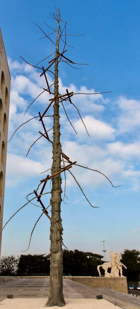 Temi, quelli dell’elevazione, della separatezza e della contingenza tra corpo e spirito, tra immanenza e trascendenza, già centrali nella lunga ricerca di Penone che, peraltro, ha spesso lavorato con la struttura – tanto concreta, scultorea, che concettuale e linguistica – degli alberi, come quelli destinati agli spazi pubblici in città di tutto il mondo, da Münster a Otterloo, da Parigi a Rotterdam, fino alle Foglie di pietra di Roma, imponente installazione in marmo e bronzo, pensata appositamente per riqualificare l’area di Largo Goldoni, promossa dalla maison Fendi.