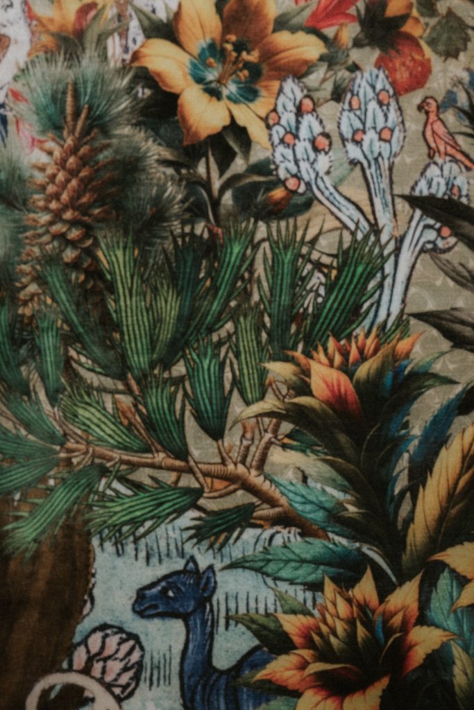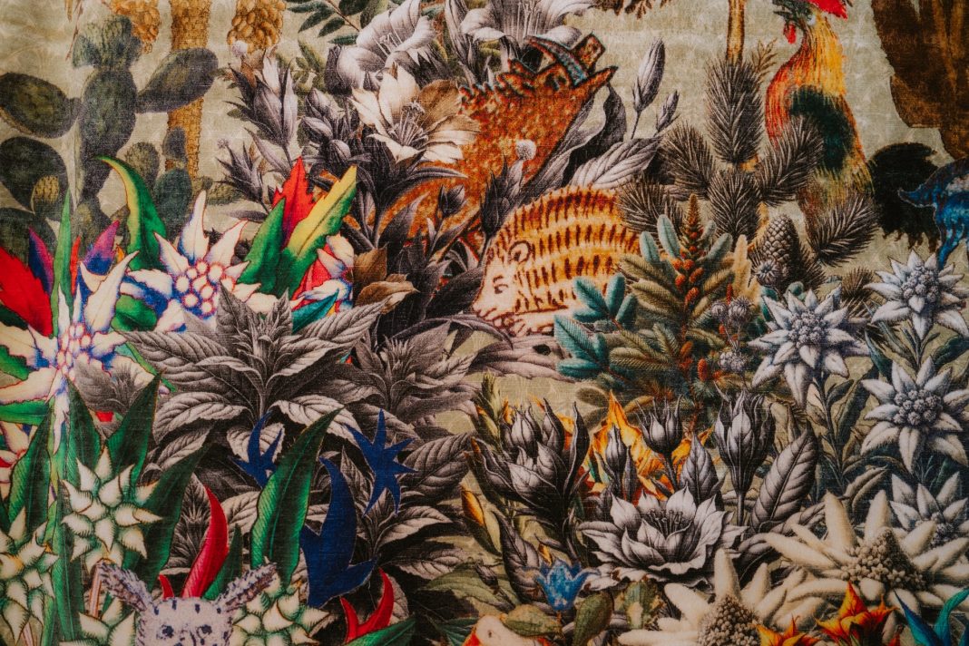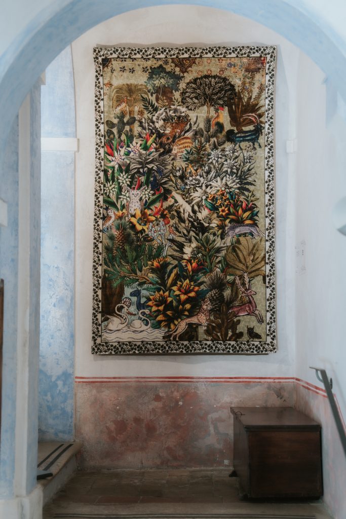 È la stessa dinamica che accade all’interno dell’arazzo concepito per la tenuta Masciarelli: se a un primo impatto vediamo un groviglio di specie animali e vegetali, delle fiere celate nella selva oscura, basta ripercorrere le trame dell’opera per notare che qualcosa non è come appare di primo acchito: assieme alle figure attinte da manoscritti, codici miniati e libri antichi, notiamo elementi scintillanti e variopinti di tutt’altro genere. Per questi ultimi, l’artista si è rivolto a uno strumento appartenente all’epoca presente, ovvero all’intelligenza artificiale. L’effetto complessivo è armonico e allo stesso tempo straniante, una consapevolezza da conquistare concedendosi il tempo di perdersi negli innumerevoli dettagli dell’opera.