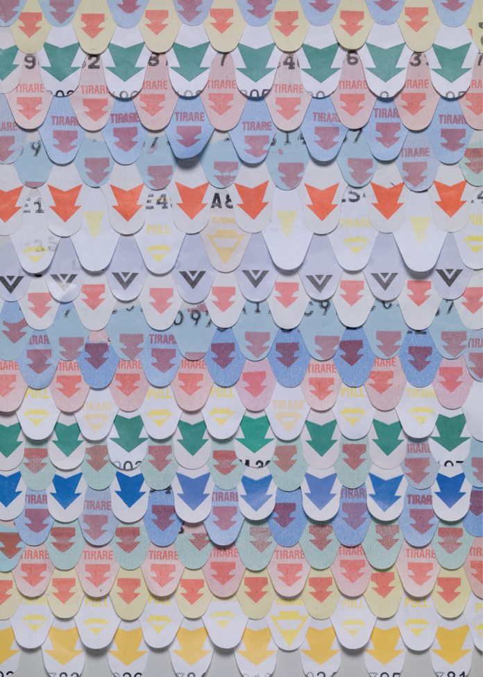 La parte più recondita della mostra, quella per intenderci adibita al Sancta Sanctorum, conferma che Dioniso è di casa. Sorvegliata da due marionette di sentinelle gravide di coriandoli (Mimus albus n.1 e n.2, 1981-2018) sta una pala d’altare recante l’immagine dipinta di una trivella (Pala Continua, 1967-2019), la quale trapassa non solo illusionisticamente lo spazio pittorico, alludendo a mistiche deflorazioni. Visti gli indizi che la precedono tutto, in questa mascherata senza tempo, racconta di riti orgiastici effigiati in perfetto stile metafisico, un po’ come in quelle sacre conversazioni dove tutti ciarlano a bocca chiusa. Tanto che un’Annunciazione anch’essa dissimulata, suggerita da un frammento d’ala ispirato a Pietro Cavallini ma confezionato con dei tagliandi distribuiti nelle file “d’attesa” (Ad ala d’Angelo, 2000), si coniuga ai sacra dionisiaci, in un sincretismo originale e a dir poco raffinato.