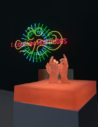 In questo contenitore magico c’è spazio anche per le luminarie, con cui Senatore combina precisi riferimenti del gusto barocco e dello stile di vita contemporaneo, interessandosi al loro costituire uno spazio effimero che facilita la socializzazione, e un nuovo corpus di lavori, esposti in galleria, che comprende – oltre alle sculture luminose e i disegni – due significative sculture in vetro fuso a cera persa: I Contain Multitudes, che riprende le parole di Walt Whitman, e Autoritratto, che presenta un calco delle mani dell’artista a grandezza naturale.