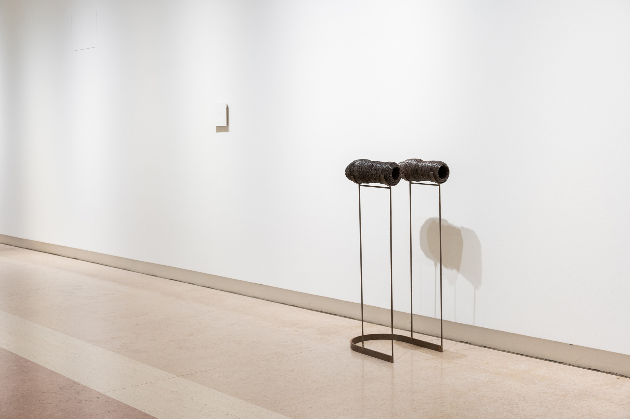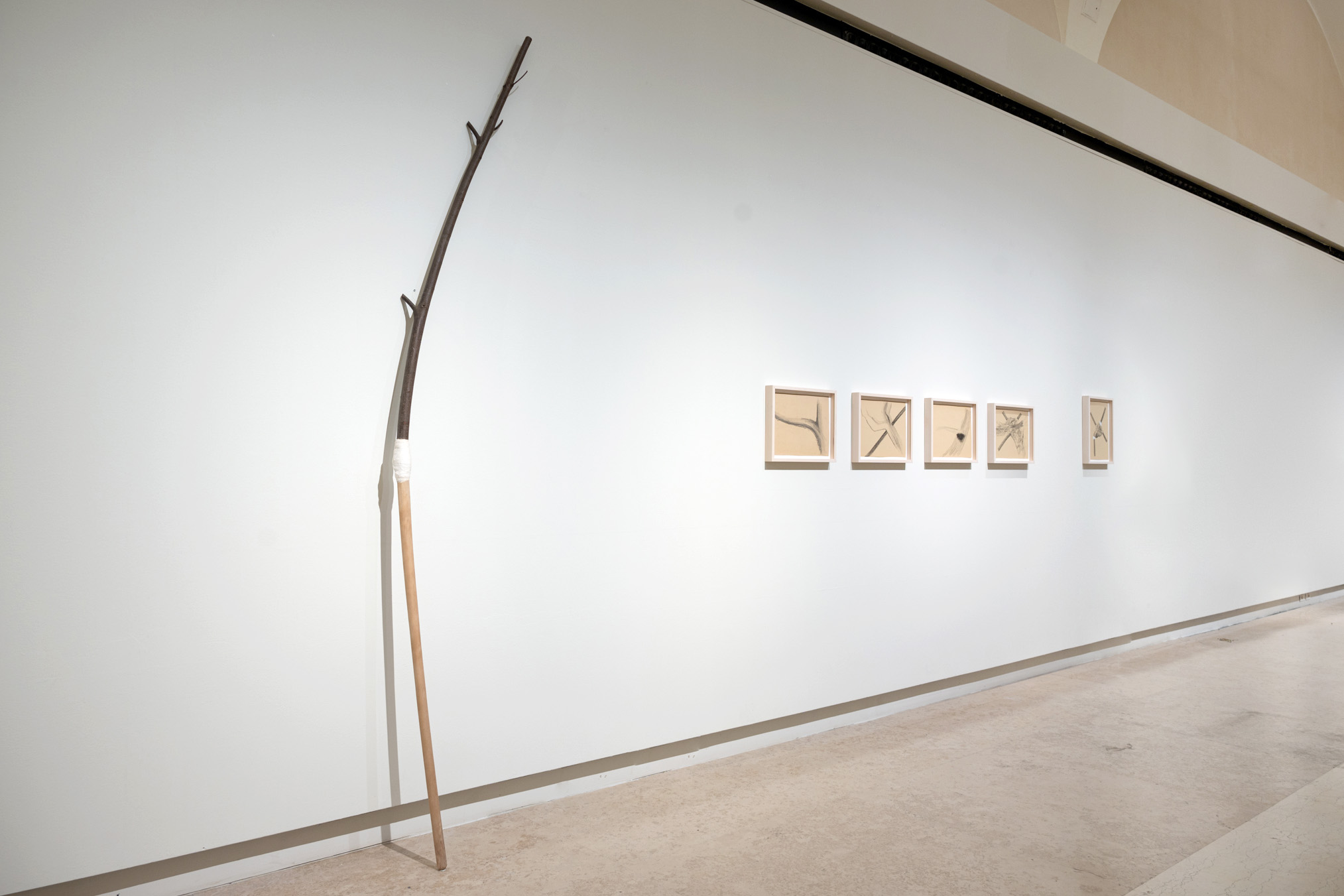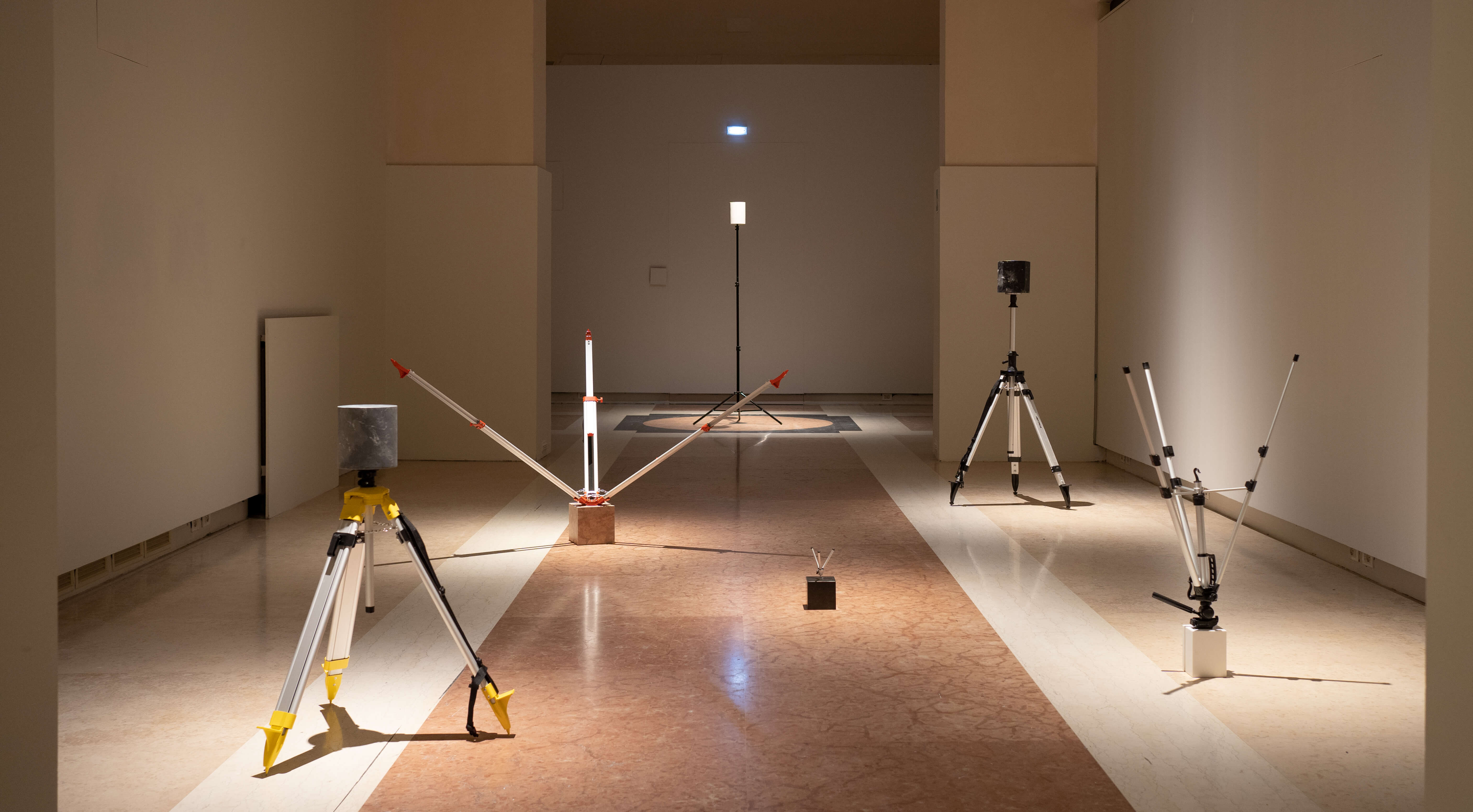 «Evidentemente esiste una relazione tra i reperti esposti al museo, che illustrano archetipicamente la fabbricazione di alcuni strumenti, e il mio lavoro. L’intrusione nella realtà museale avviene anche tramite il ricorso all’imprevisto e all’accettazione della svista. Si generano così situazioni ibride e le condizioni con cui cerco di dialogare nel luogo che mi ospita. È come se alcune voci giungessero inaspettatamente da sopra, espandendosi negli spazi neutri della mostra».