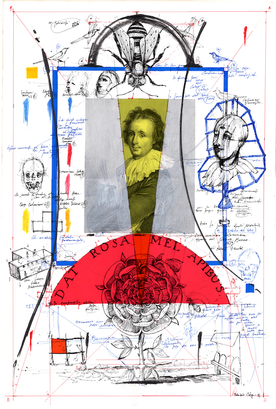 «Per me il tempo non è mai lineare o cronologico: è una dimensione mistica. Lavoro per suggestioni temporali. Posso partire da un’incisione del Seicento, ad esempio una Mappa Celeste, e costruire attorno un universo visivo in cui le immagini si fondono, si accostano, si riscrivono. Nulla viene sottratto, nulla viene profanato: il vero e il falso si intrecciano senza soluzione di continuità».