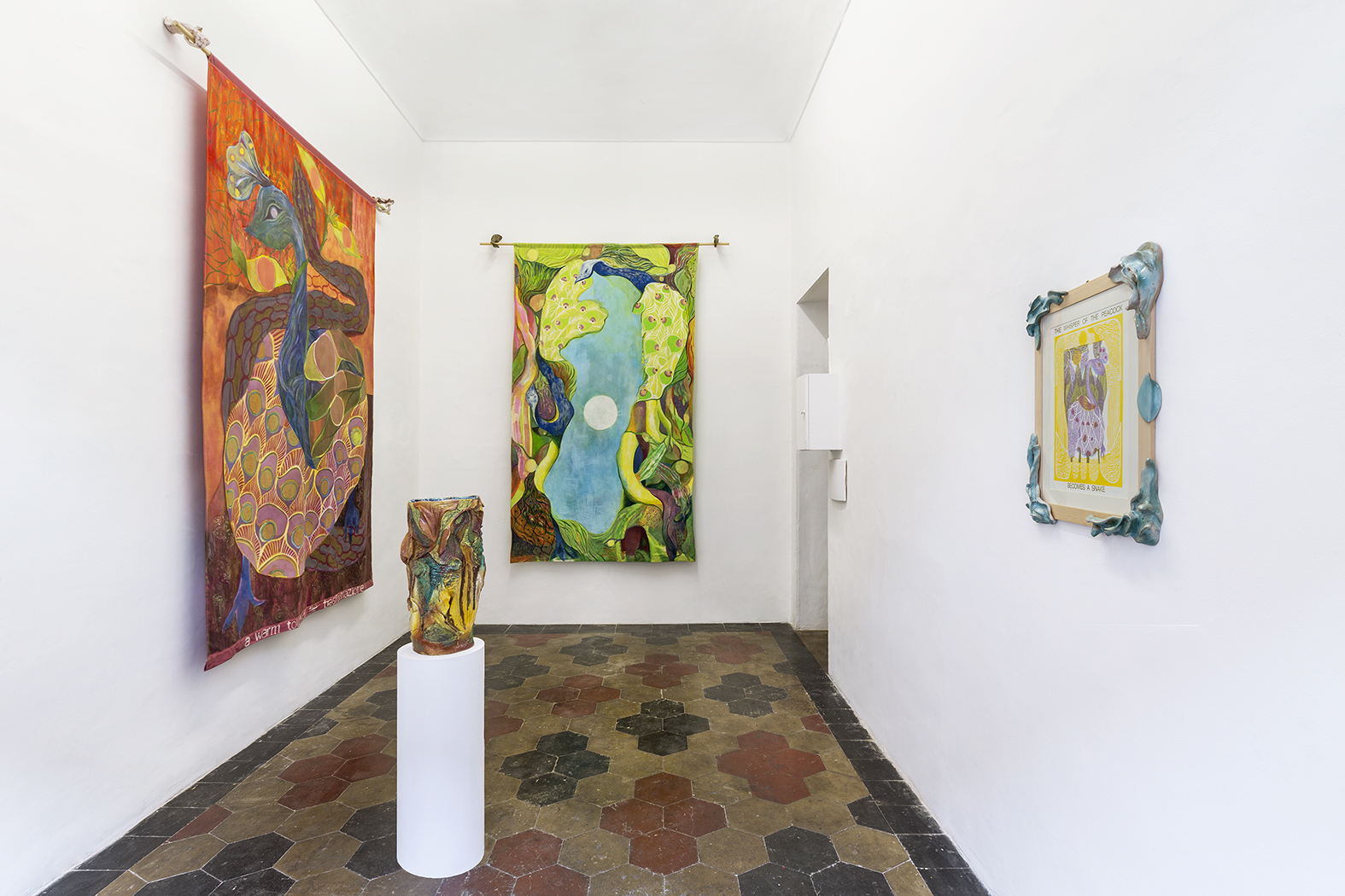 Come sempre da Quartz, la mostra è curata scrupolosamente in ogni dettaglio, e anche l’allestimento, pur nel piccolo spazio, appare ritmato da una geometria molto studiata, fatta di volumi simmetrici e riflessi armonici. L’atmosfera evocata dalle opere esposte non è, poi, a sua volta priva di rimandi storico artistici variegati, che vanno dall’esotismo decadente di Henri Rousseau, fino alle fantasticherie fiorite di psichismi alchemici di Ontani, passando per lavori più recenti, come per esempio quelli di Alice Visentin. È però soprattutto l’idea dell’arazzo rinascimentale, dove a simboli neoplatonici si intrecciano elementi naturalistici e significati simbolici più o meno esoterici, che può aiutare a comprendere questi lavori.