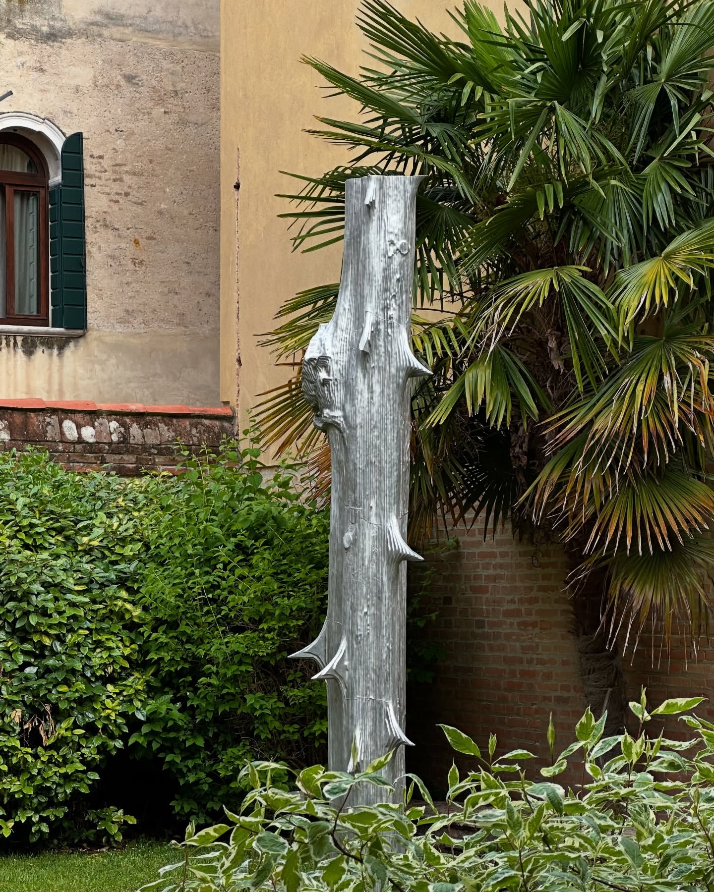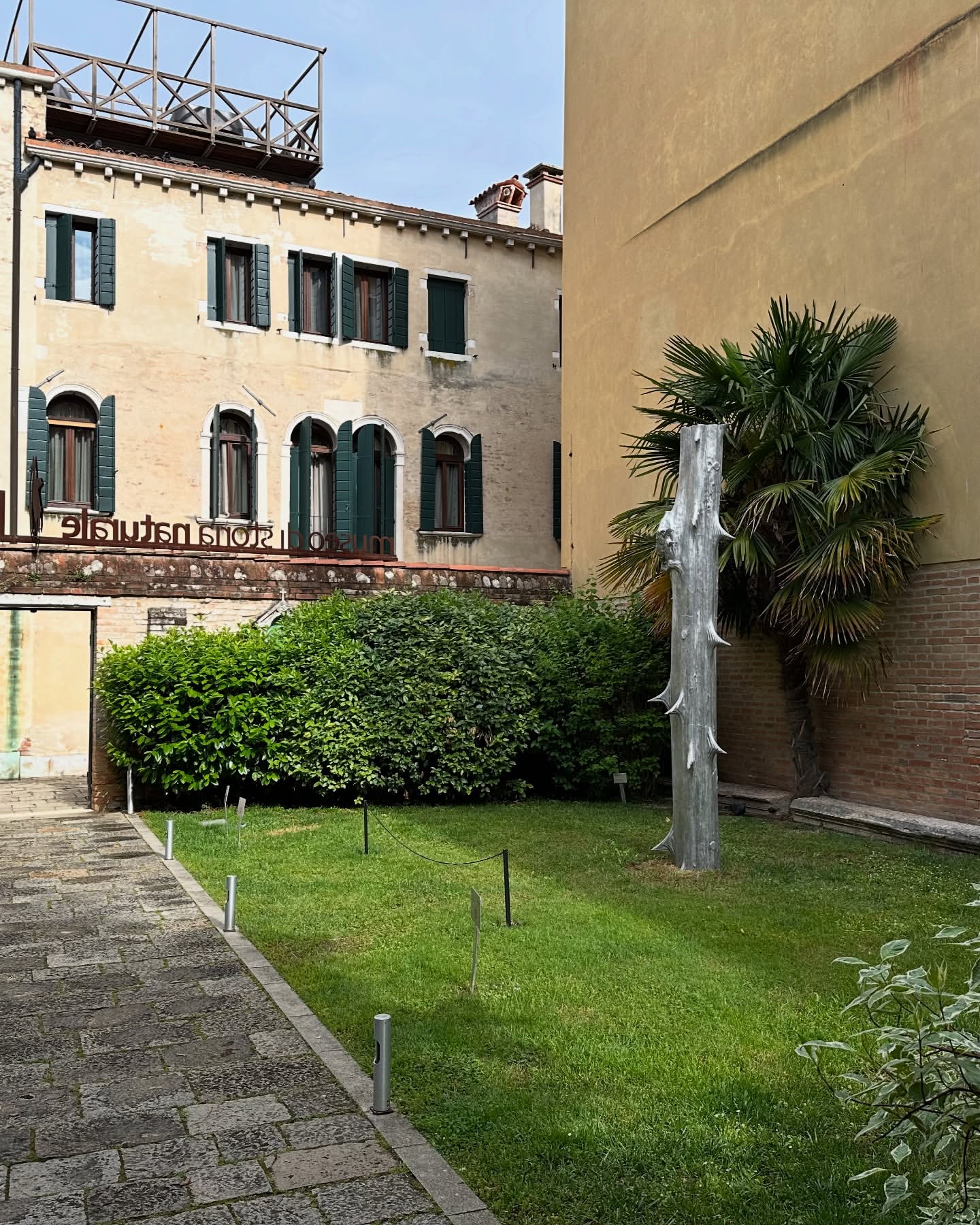 Nel giardino d’ingresso del Museo di Storia Naturale Giancarlo Ligabue di Venezia, si erge Megaflora (2021) di Alice Channer: uno stelo di rovo alto oltre tre metri, monumentale e inquieto. Realizzata tramite una colata di alluminio in sabbia a partire da una scansione 3D, la scultura nasce dalla manipolazione digitale di un elemento vegetale comune e finisce per trasformarsi in un ibrido metallico, surreale e straniante. Esposta per la prima volta all’aperto, dopo il successo alla Summer Exhibition 2022 della Royal Academy di Londra, Megaflora si misura ora con il contesto lagunare, diventando punto di contatto tra le collezioni scientifiche del museo e l’immaginario artistico contemporaneo.