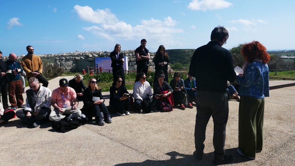 Concetta Modica, Liturgia dei sepali, immagine della performance /preghiera collettiva nel parco archeologico di Gozo, 13 marzo 2026