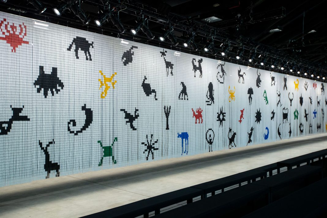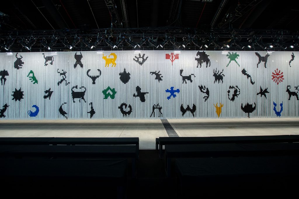 52 metri di lunghezza e oltre 120mila tessere: sono i numeri che compongono Take me into your dreams, among your darkest thoughts, questo il titolo della lunga tenda che ha dominato l’identità visiva di Etro durante l’ultima sfilata della Fashion Week Milano Moda Donna. Un codice crittografato, un sogno, un graffito fluttuante al passaggio di modelle e modelli: l’opera è frutto di Numero Cromatico, collettivo con base a Roma fondato nel 2011 da Dionigi Mattia Gagliardi. Centro di ricerca ed editore, il gruppo si compone oggi di 20 collaboratori, ricercatori afferenti alle più disparate discipline artistiche e scientifiche.