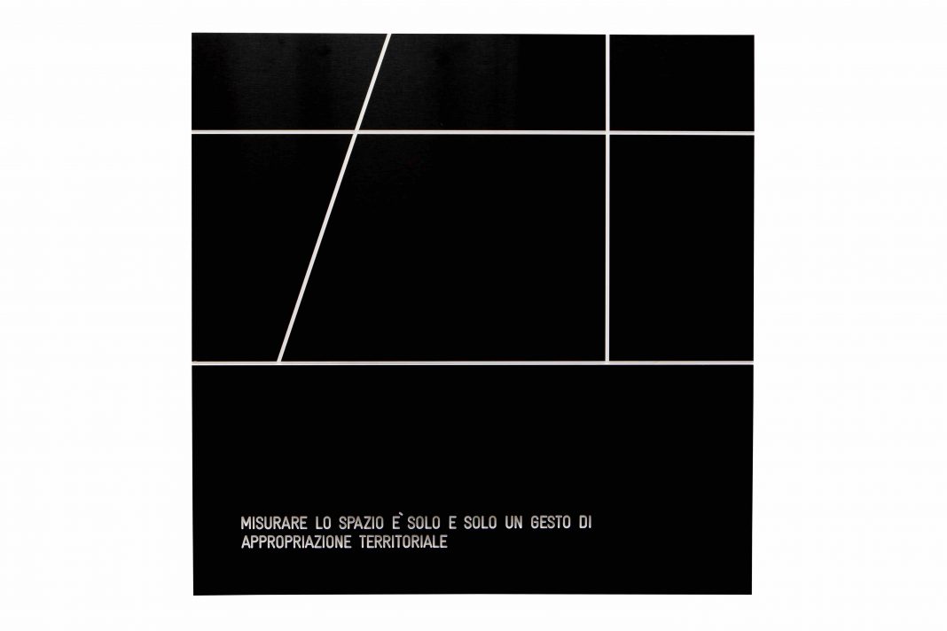 Luca Vitone espone alcuni suoi lavori sulle comunità Rom, il popolo nomade opposto a ogni territorialità, tra i concetti centrali indagati da Agnetti con i suoi feltri, le grafiche e gli assiomi sull’argomento, fra tutti “Misurare lo spazio è solo e solo un gesto di appropriazione territoriale”.