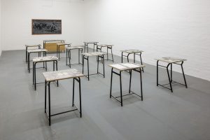 Dulcis in fundo, l’installazione preparata appositamente per questo appuntamento veneziano, una sorta di cosmogonia disegnata e graffiata su cattedra e banchi di scuola, in cui le dodici materie elementari si sommano a visioni dell’oggi, in un magma densissimo di stimoli visivi. Il vuoto di sedie, inutili dal momento che la classe non è fatta per contenere esseri umani ma solo icone di questo stream of consciousness maniacalmente riprodotto nell’incessante disegnare di Mastrovito, prende alla gola, riportando ognuno all’implacabile realtà che il mondo sta attraversando.