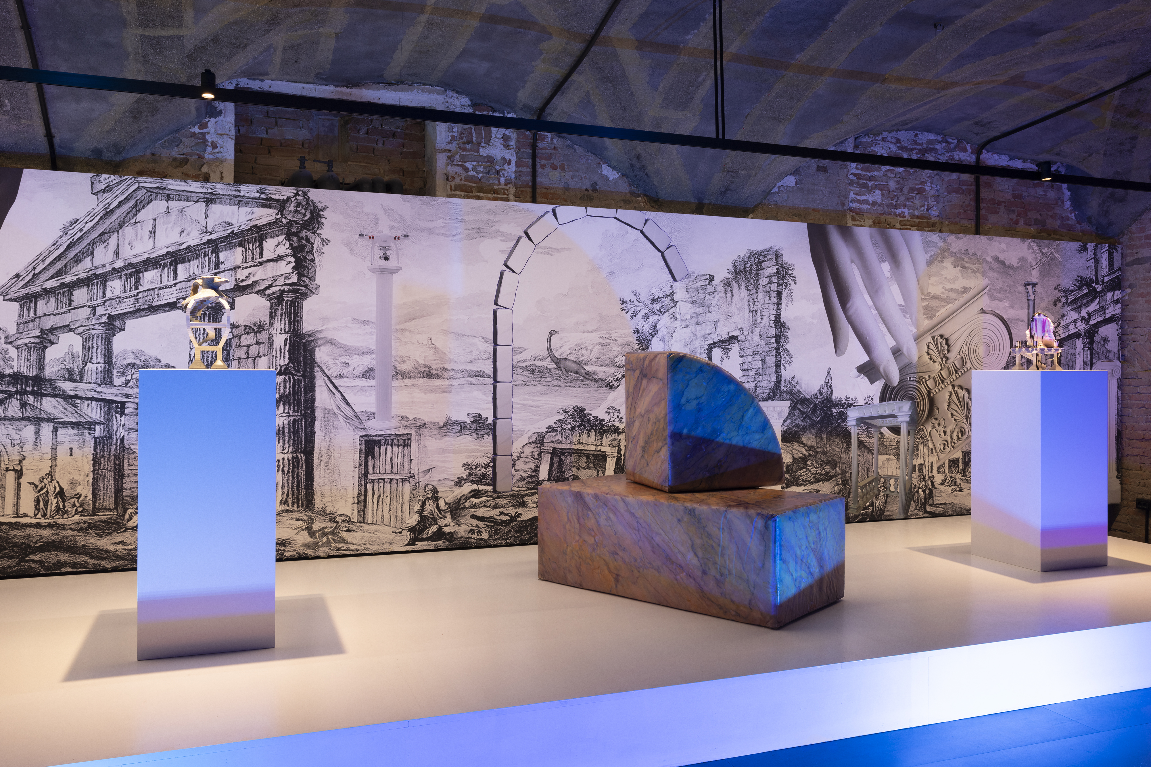 Quell’ibrido ci accoglie a palazzo Bentivoglio con una lunga carta da parati con stampate incisioni di rovine antiche intervallate da architetture sintetiche. Davanti alla carta da parati, si stagliano piccoli oggetti architettonici stampati in 3D con rovine, nature morte, spazi fantastici che immettono nel mondo reale costruzioni digitali. Avviene quel che Nicolas Bourriaud proclamava in Postproduction: l’artista ritrova molto materiale già pronto nel digitale o nelle immagini antiche, gli costruisce un packaging adeguato e lo immette nel mondo reale. Questo altalenare tra virtuale e reale costituisce l’ossatura della poetica di Angelidakis che ragiona sulla funzione dell’architettura nell’epoca dei social network, dell’impazienza diffusa, della disattenzione e dell’effetto shock che ne consegue.