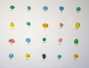 La parte maggiormente performativa dell’esposizione è data da Stringere lo spazio (di me e te), un’installazione site-specific composta da piccole sculture in terracotta colorata affisse al muro. Si tratta del “risultato” di strette di mano date tra le persone che nel corso dell’estate, quando il distanziamento interpersonale era maggiormente consentito, hanno frequentato la galleria. Una piccola quantità di argilla fresca, posta nel palmo della mano a suggellare la stretta di mano tra due persone, amici, fidanzati, ma anche perfetti sconosciuti. Una volta seccate, dipinte e cotte, ne scaturiscono forme molto eterogenee, aggressive o delicate, frastagliate o compatte, ma ognuna porta incisa l’impronta di una relazione, di un’amicizia, di un amore…