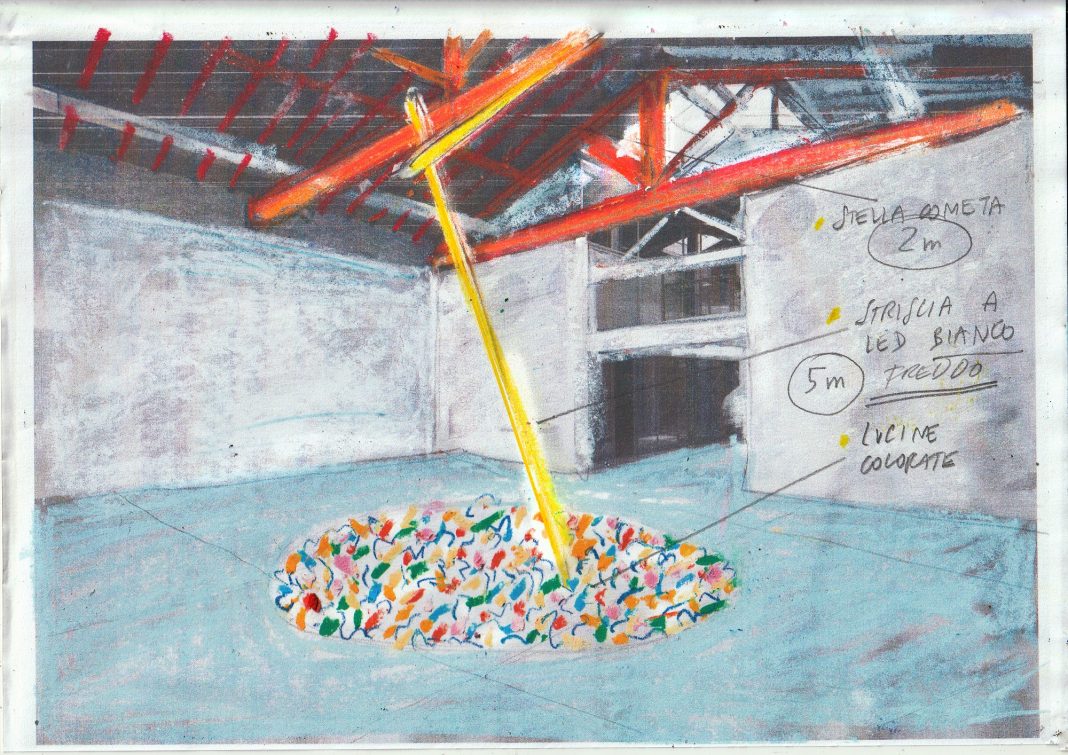 Si tratta di un albero costituito dai consueti tre elementi, chioma, fusto e puntale ripensati dagli artisti in chiave essenziale e minimale. La chioma è data da una miriade di piccole luci colorate poste a terra a formare un cerchio sul pavimento. Da questa distesa di lucine intermittenti si erge un asse verticale inclinato a simulare il fusto dell’albero la cui cima si interseca con una striscia di luce che funge da puntale e che si accende in tempo reale al passaggio di una stella cadente. Ciò è possibile grazie a un collegamento streaming permanente con il Radiotelescopio di Medicina in provincia di Bologna, concesso dall’Istituto Nazionale di Astrofisica (INAF), che permette di captare attraverso le onde radio i fenomeni dell’atmosfera, come i meteoriti.