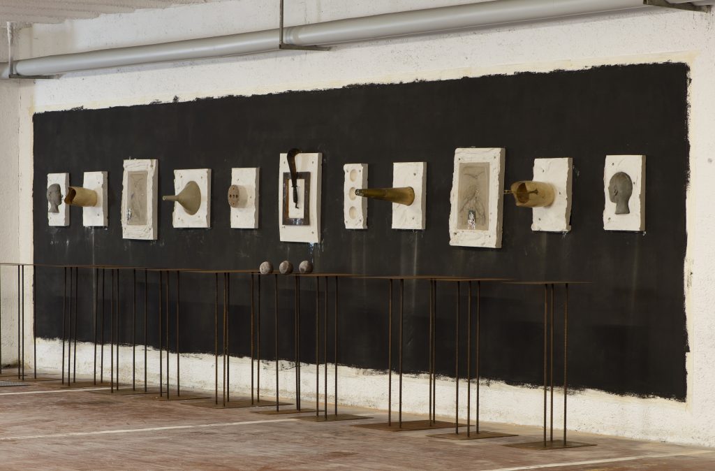 A esporre sono artisti che hanno deciso di farlo gratuitamente, li ringraziamo tutti, hanno scelto opere grandissime: ci sono quella di Mimmo Paladino lunga sette metri, quella di Antonio Riello di dodici metri, quella di Enrico T. De Paris di undici metri, quella di Stefano Arienti di due metri per due dipinta a mano sul muro e molte altre. Ci sono grandi fotografie, grandi dipinti, grandi buchi nel muro, dei cappi: 17 opere di 18 artisti, tra cui Antonio Marras, che è stato qui per tre giorni a fare la sua opera. La mostra ha appassionato molto gli artisti, speriamo anche gli spettatori».