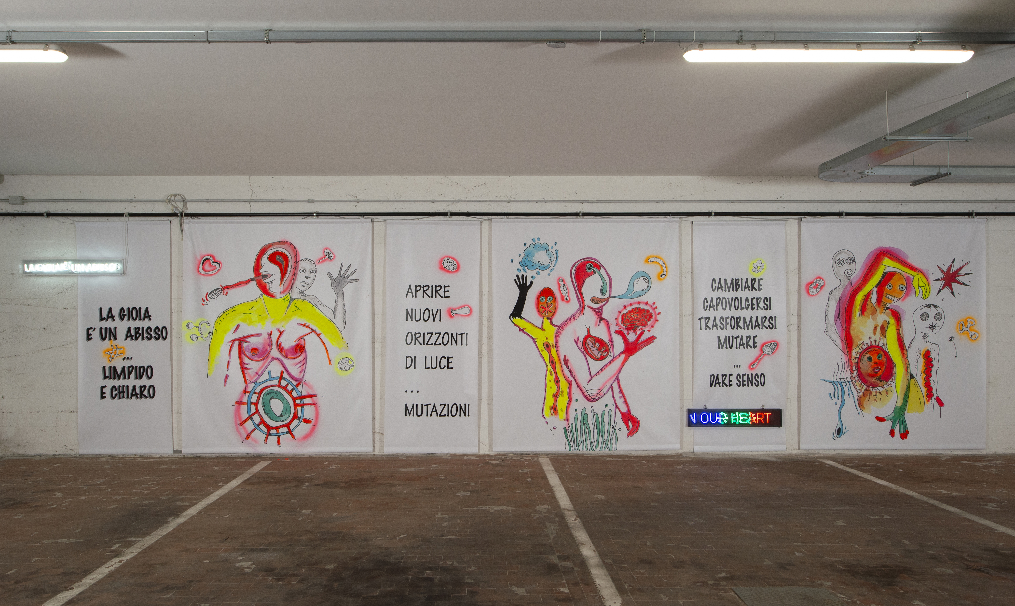 «Non è stato assegnato un tema specifico agli artisti, ognuno di loro è libero di proporre la propria visione al pubblico che, percorrendo il garage in auto, può scegliere da quale racconto immaginifico farsi suggestionare in questa sorta di temporanea multisala underground», si legge nel comunicato stampa.