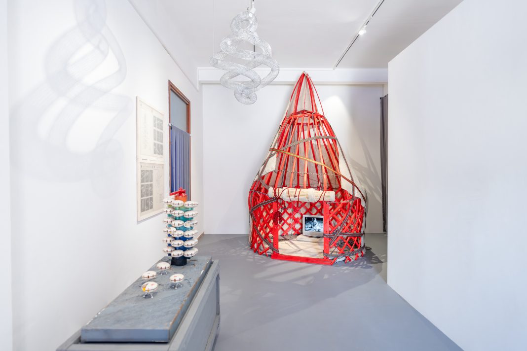Nella sezione successiva, l’arte di Sergey Maslov e Yerbolat Tolepbay si distingue per l’audace esplorazione della connessione tra l’umanità e il cosmo. Sergey Maslov, pioniere della fotografia digitale come forma artistica, ha sfidato i confini della percezione visiva combinando la yurta kazaka con immagini di astronavi e extraterrestri. In Baikonur-2, emerge la sua visione provocatoria del futuro esplora la possibilità di una coabitazione tra umani e altre specie aliene, riflettendo sulle implicazioni culturali e cosmiche di un’interazione interplanetaria. Mentre in Six Lives of One Soul, The End of the Beginning and the Beginning of the End, Mobile Unit, Saken Narynov propone un progetto di sinergia abitativa fra tradizione kazaka e vita-interplanetaria, in cui si immagina delle strutture abitative singole, che richiamano per la struttura architettonica alla tradizione kazaka, pronte ad staccarsi dall’albero maestro per viaggiare nello spazio.