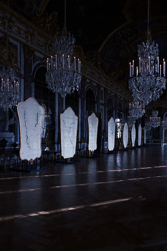 Così, nella reggia di Versailles ripresa di notte, i grandi specchi in cera irti di spine e alti tre metri e mezzo, ognuno del peso di 400 chili, sono stati disposti davanti agli specchi che dovevano esaltare la gloria del monarca. «Considero questi specchi femministi, perché mettono il conflitto nel luogo del potere regale», spiega Giambrone, che ammette di non avere mai avuto i mezzi per realizzare un progetto di questa portata.