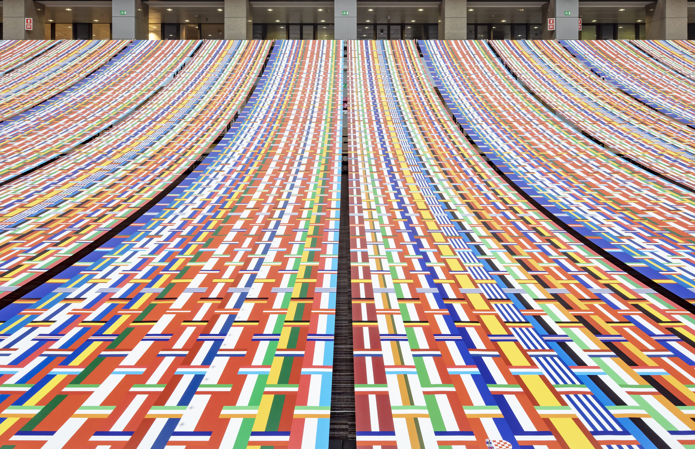 “L’Étoffe de l’Europe” è il titolo del progetto scenografico e artistico che investe in questo primo semestre dell’anno, il palazzo Justus Lipsius e il palazzo Europa a Bruxelles, in occasione della presidenza francese. Arte e potere a braccetto, dunque. Ogni sei mesi infatti, vengono proposte dallo Stato che assicura la presidenza del Consiglio dell’Ue, installazioni artistiche di rilievo, come per il Terzo Paradiso di Michelangelo Pistoletto durante la presidenza italiana del 2014. Il progetto francese è stato concepito per il Segretariato generale del Consiglio dell’Ue, e per la sede del Consiglio europeo e del Consiglio dell’Ue, dagli Ateliers Adeline Rispal in collaborazione con Si – Studio irresistible. Il primo è un noto studio di architettura parigino specializzato in progetti culturali e scenografie come musei, mostre e fiere mondiali, il secondo è un’agenzia parigina di consulenza in comunicazione visiva dedicata a progetti culturali, etici e obiettivi di sviluppo sostenibile. La loro proposta, partendo dall’idea di un operare comune per tessere l’Europa di domani, vede una trama figurativa che s’ispira alle bandiere dei paesi membri dell’Ue e che varia a seconda dei supporti su cui è riprodotta. Le creazioni si dislocano lungo sette spazi che vanno dall’atrio del palazzo Justus Lipsius – che accoglie un’installazione monumentale di 650 mq di voile del peso di 60 chili – agli ascensori, ai corridoi e una zona relax, ai saloni della presidenza fino al Forum Europa. In quest’ultimo, troviamo un affresco digitale di 16 metri, cioè un data-tissage che ripercorre la storia dell’Ue, la sua costruzione progressiva e le sue presidenze di turno.